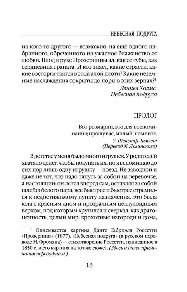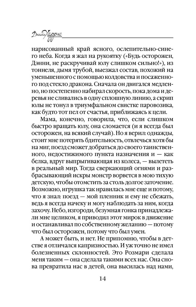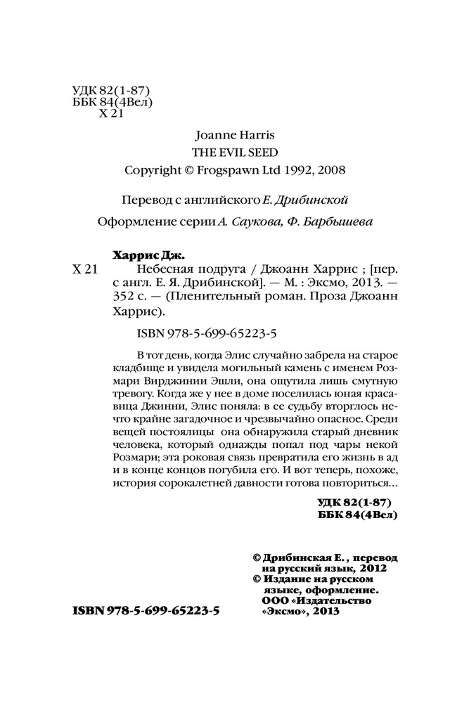 Небесная подругаВ данный момент этот товар отсутствует в продаже. Возможно, у нас найдется аналогичный или похожий товар здесь. Серия: Пленительный роман. Проза Джоанн Харрис (обложка) В тот день, когда Элис случайно забрела на старое кладбище и увидела могильный камень с именем Розмари Вирджинии Эшли, она ощутила лишь смутную тревогу. Когда же у нее в доме поселилась юная красавица Джинни, Элис поняла: в ее судьбу вторглось нечто крайне загадочное и чрезвычайно опасное. Среди вещей постоялицы она обнаружила старый дневник человека, который однажды попал под чары некой Розмари; эта роковая связь превратила его жизнь в ад и в конце концов погубила его. И вот теперь, похоже, история сорокалетней давности готова повториться. |
