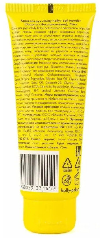 💳 Оплатить за товар можно при получении 🇰🇿 Есть бесплатная доставка по Казахстану от 1 дня 🎁 Копите бонусы с каждой покупки Крем для рук «Holly Polly» Soft Powder с пантенолом образует особую пленку, создавая эффект «невидимых перчаток», защищает кожу рук от агрессивных внешних воздействий: жесткой хлорированной воды, ветра, сухого воздуха и мороза. Оказывает регенерирующее воздействие на кожу, защищает и питает, устраняя сухость и шелушения! Масло оливы в составе увлажняет кожу, возвращает ей упругость и эластичность, придает блеск и укрепляет ногтевую пластину. А нежный пудровый аромат крема подарит положительные эмоции! |