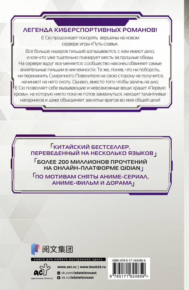 Серия: Аватар короля Е Сю продолжает покорять вершины на новом сервере игры «Путь славы». Все больше лидеров гильдий догадываются, с кем имеют дело, и кое-кто уже тщательно планирует месть за прошлые обиды. На сервере вдруг все меняется: сообщество наконец обвиняет самые влиятельные гильдии в никчемности. Те же, поняв, что ни побороть, ни переманить Сумрачного Повелителя на свою сторону не получится, начинают на него охоту. Однако, вместо того чтобы залечь на дно, Е Сю позволяет себе вызывающие и невозможные вещи: крадет «Первую кровь», на которую никто пока не готов замахнуться, находит талантливых напарников и даже объединяет заклятых врагов во имя общей цели! |