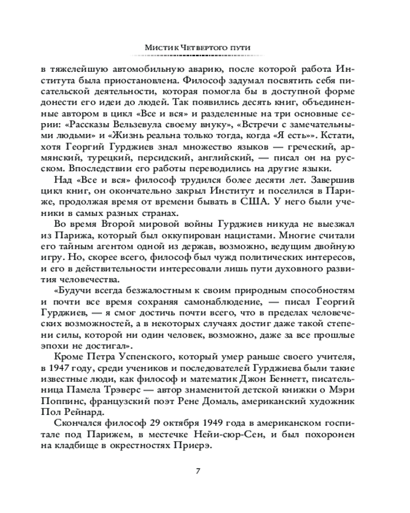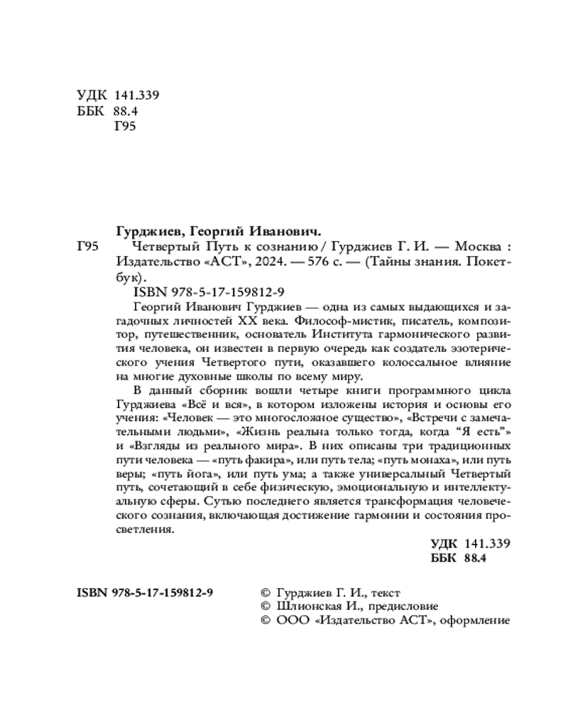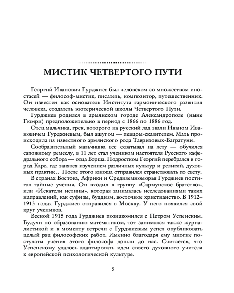 💳 Оплатить за товар можно при получении 🇰🇿 Есть бесплатная доставка по Казахстану от 1 дня 🎁 Копите бонусы с каждой покупки Серия: Тайны знания. Покетбук Георгий Иванович Гурджиев — одна из самых выдающихся и загадочных личностей ХХ века. Философ-мистик, писатель, композитор, путешественник, основатель Института гармонического развития человека, он известен в первую очередь как создатель эзотерического учения Четвертого пути, оказавшего колоссальное влияние на многие духовные школы по всему миру. |