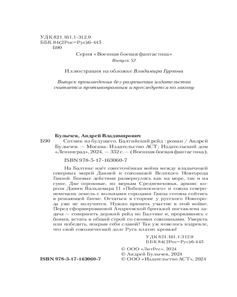 💳 Оплатить за товар можно при получении 🇰🇿 Есть бесплатная доставка по Казахстану от 1 дня 🎁 Копите бонусы с каждой покупки Серия: Военная боевая фантастика На Балтике идёт ожесточённая война между владычицей северных морей Данией и союзницей Великого Новгорода Ганзой. Боевые действия развернулись как на море, так и на суше. Две огромные, по меркам Средневековья, армии: короля Дании Вальдемара II «Победоносного» и союза северонемецких земель с вольными городами Ганзы готовы сойтись в решающей битве. Остаться в стороне у русского Новгорода уже не получится. Нужно принять участие в этой войне. Перед сформированной Андреевской бригадой поставлена задача — совершить дерзкий рейд по Балтике и, прорвавшись с боями, встать в общий строй со своими союзниками. Умереть или победить, покрыв себя славой! Так уж повелось издревле, что свой союзнический долг Русь платит кровью! |