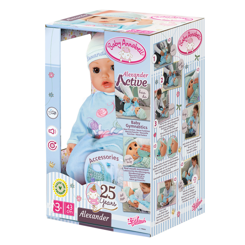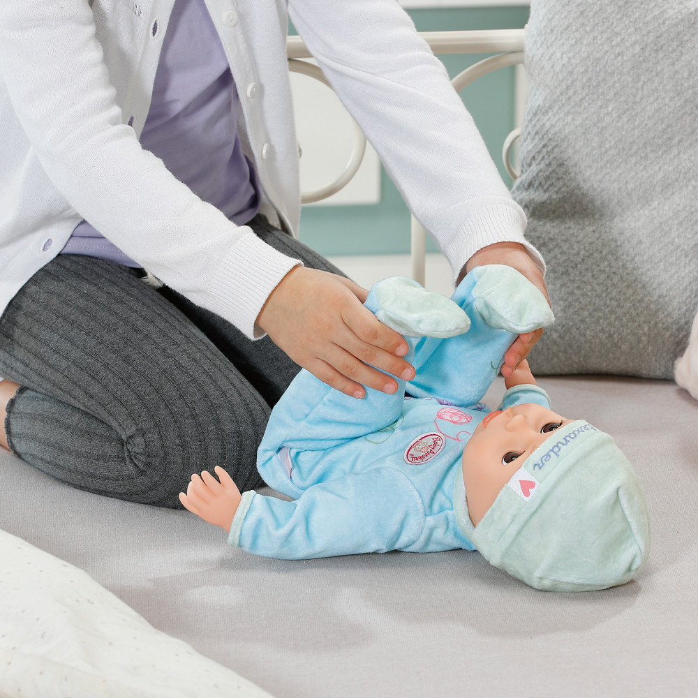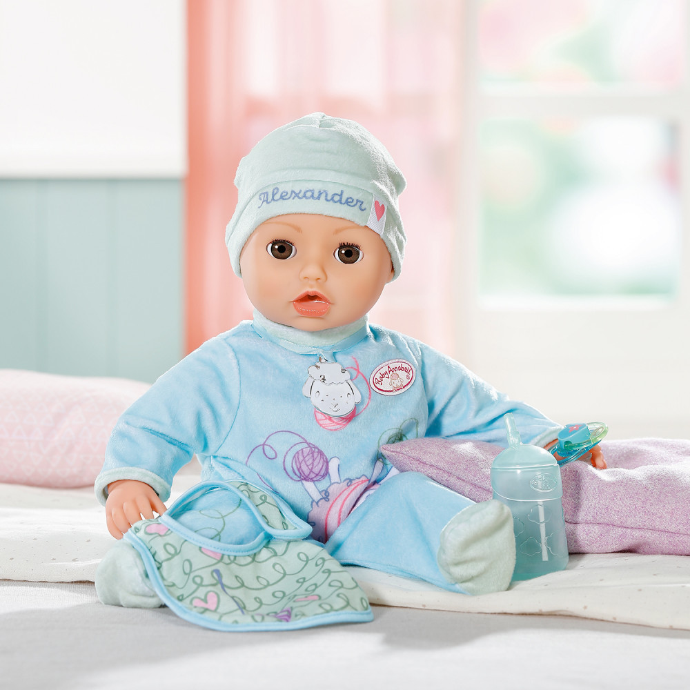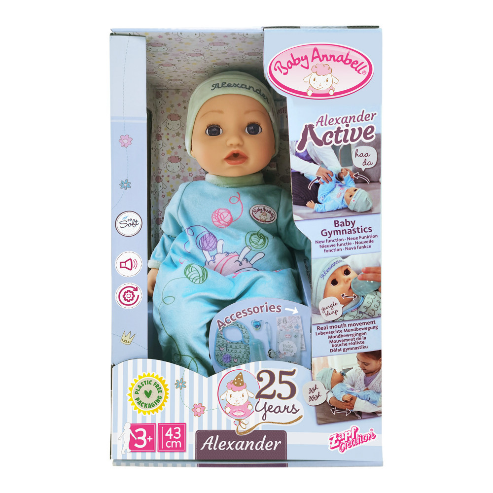 Познакомьтесь с куклой Беби Анабель Александр 43см! На улице еще светло и Александр никак не хочет спать? Просто укачай куклу и положи в горизонтальное положение, её глазки закроются и она начнет посапывать. После сна любой день можно начинать с весёлой зарядки. У куклы 5 интерактивных функций: умеет закрывать глазки и засыпать, с ней можно заниматься гимнастикой, произносит первые звуки как настоящий младенец, умеет двигать губами и сосать соску. Беби Анабель как настоящий младенец!