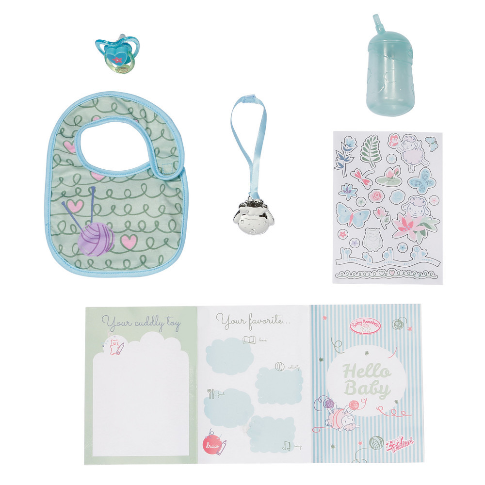 В комплекте: 4 аксессуара, которые используют для игры с куклой: бутылочка, соска, слюнявчик, браслет, инструкции.