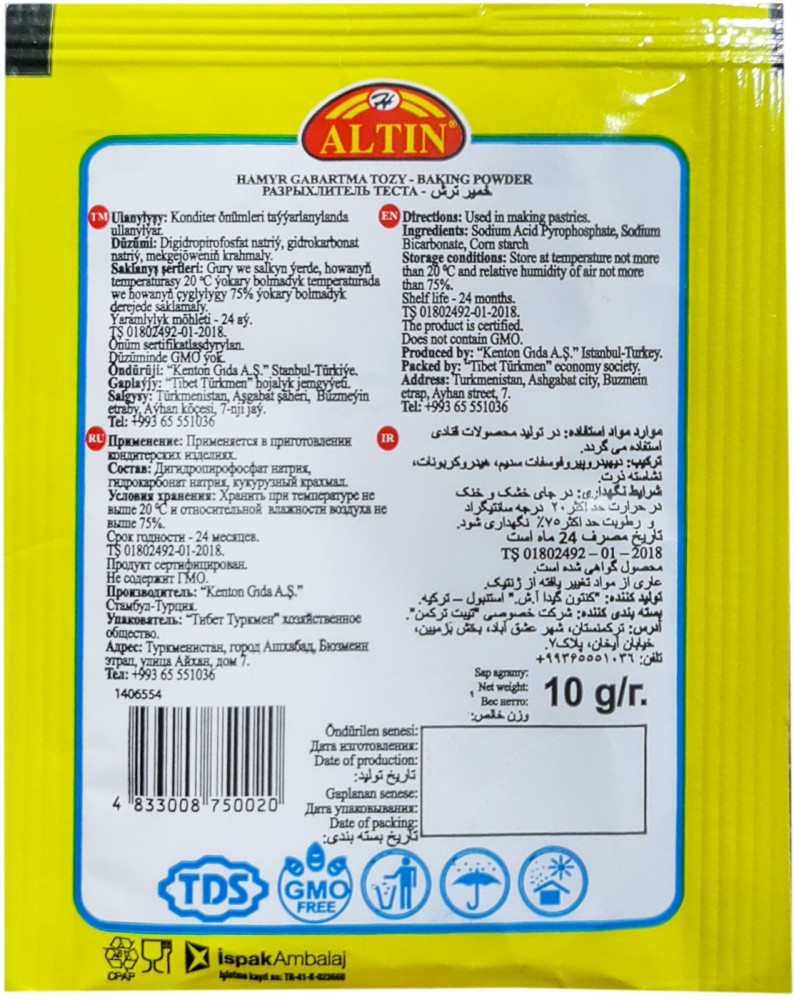 Altin Разрыхлитель тестаВ данный момент этот товар отсутствует в продаже. Возможно, у нас найдется аналогичный или похожий товар здесь. Применяется для получения пористой структуры, увеличения объема и поднятия теста. Специальные разрыхлители, добавленные в муку, при нагревании во время выпечки выделяют углекислый газ и поднимают тесто. Рекомендуется использовать для любого не дрожжевого теста. |