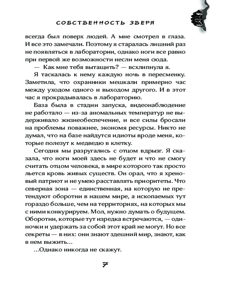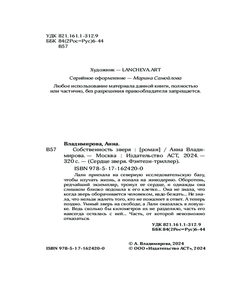 Собственность зверяВ данный момент этот товар отсутствует в продаже. Возможно, у нас найдется аналогичный или похожий товар здесь. Серия: Сердце зверя. Фэнтези-триллер Лали приехала на северную исследовательскую базу, чтобы изучать жизнь, а попала на живодерню. Оборотень, редчайший экземпляр, тронул ее сердце, и однажды она слишком близко подошла к его клетке... Она не знала, что когда зверь оборачивается человеком, надо бежать... Не знала, что нельзя жалеть того, кто не пожалеет в ответ. А теперь поздно. Умный зверьна свободе, а Лали оказалась в ловушке. Ведь сколько бы километров их не разделяло, часть его навсегда осталась с ней... Часть, от которой невозможно отказаться. |