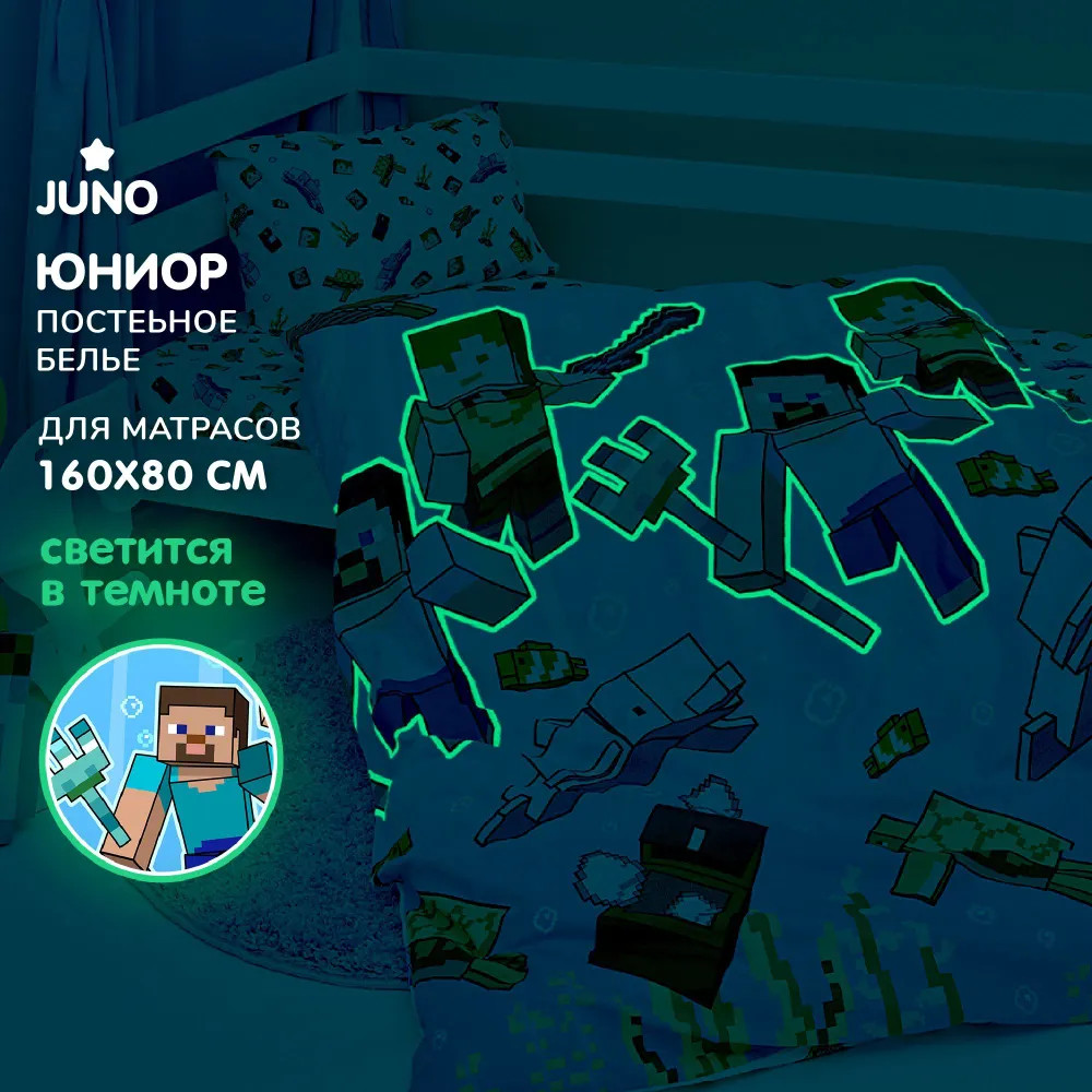 Juno Комплект постельного белья «Подводный майнкрафт»В данный момент этот товар отсутствует в продаже. Возможно, у нас найдется аналогичный или похожий товар здесь. Комплект от «Juno» — это не только стильное и качественное белье для детей. Это — креативные идеи и забота о детях, воплощенная в каждом комплекте. Этот комплект постельного белья для мальчика выделяется ярким дизайном с персонажами из Майнкрафт. Такой увлекательный принт безусловно завоюет сердце вашего ребенка, а еще он светится в темноте! |