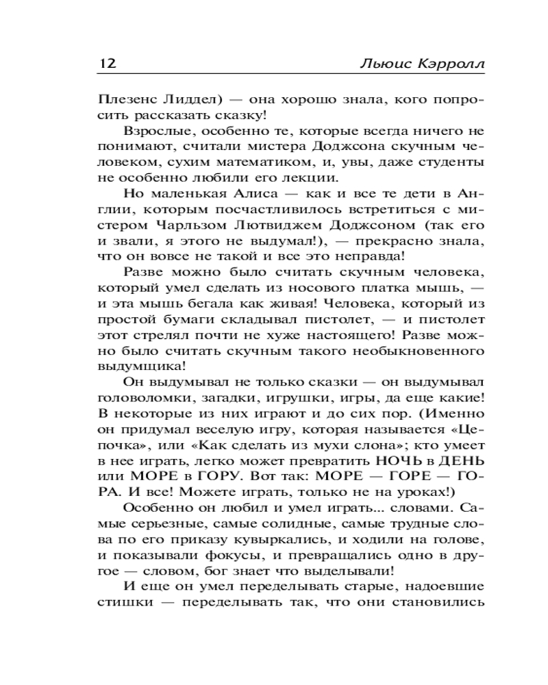 💳 Оплатить за товар можно при получении 🇰🇿 Есть бесплатная доставка по Казахстану от 1 дня 🎁 Копите бонусы с каждой покупки Серия: Лучшая мировая классика В легендарных сказках «Алиса в Стране чудес» и «Алиса в Зазеркалье» находили и находят источник вдохновения не только литературоведы, но и физики и философы, шахматисты и математики, психологи и психоаналитики, музыканты и художники. Бесчисленное множество экранизаций и адаптаций, музыкальные постановки, компьютерные игры, иллюстрации лучших художников, переводы чуть ли не на все языки мира... Эти очаровательные сказки, полные веселья и серьезных мыслей, вот уже почти два столетия не оставляют равнодушными ни детей, ни взрослых всех возрастов во всем мире. |