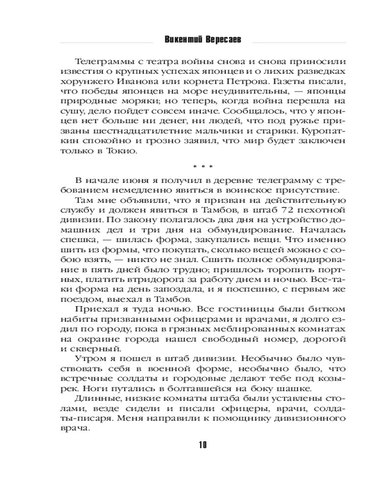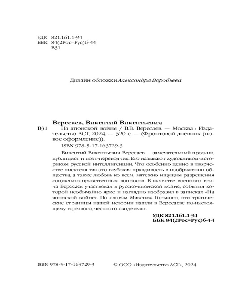 💳 Оплатить за товар можно при получении 🇰🇿 Есть бесплатная доставка по Казахстану от 1 дня 🎁 Копите бонусы с каждой покупки Серия: Фронтовой дневник (новое оформление) Викентий Викентьевич Вересаев — замечательный прозаик, публицист и поэт-переводчик. Его называют художником-историком русской интеллигенции. Что особенно ценно в творчестве писателя так это глубокая правдивость в изображении общества, а также любовь ко всем, мятежно ищущим разрешения социально-нравственных вопросов. В качестве военного врача Вересаев участвовал в русско-японской войне, события которой необычайно ярко и наглядно изобразил в записках «На японской войне». По словам Максима Горького, эти трагические страницы нашей истории нашли в Вересаеве по-настоящему «трезвого, честного свидетеля». |
