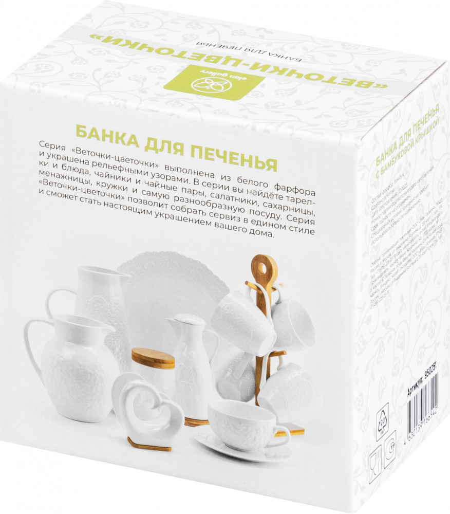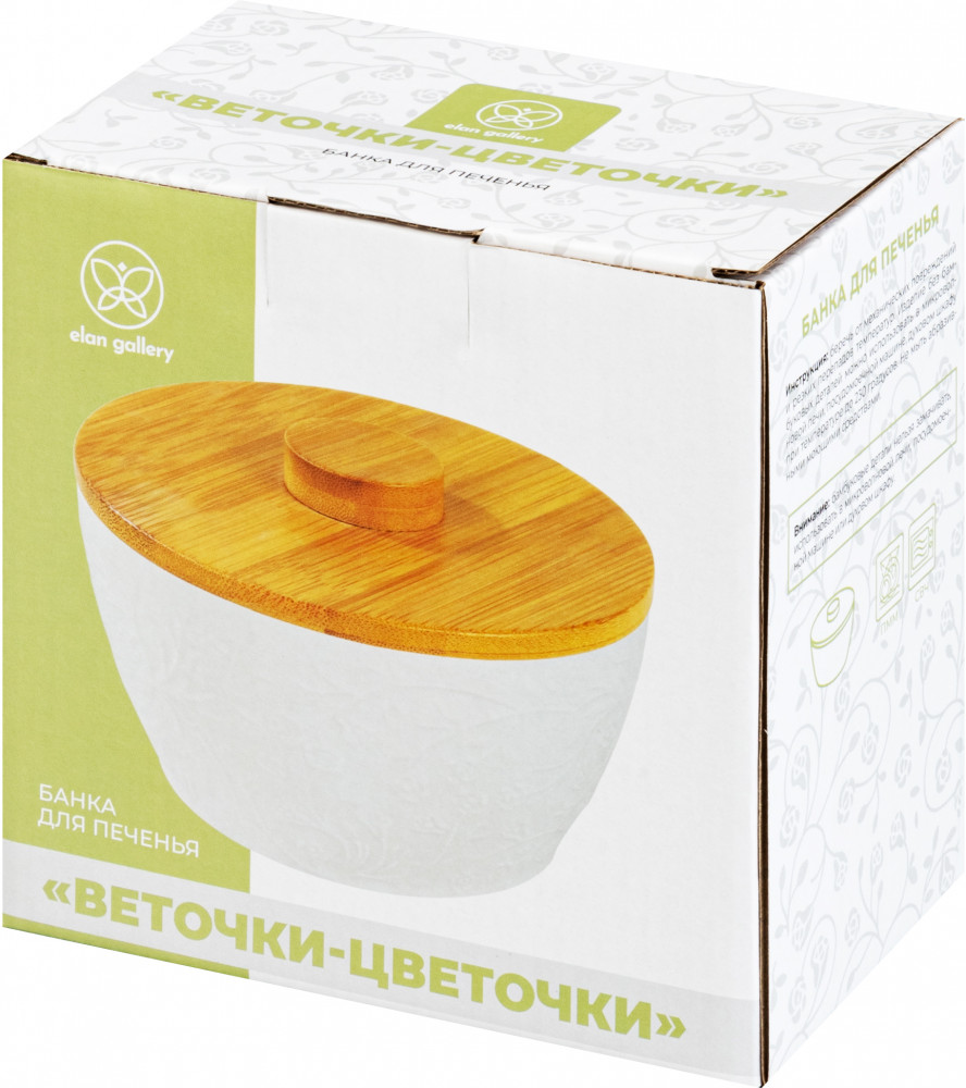 Elan Gallery Банка для печенья «Веточки-цветочки»В данный момент этот товар отсутствует в продаже. Возможно, у нас найдется аналогичный или похожий товар здесь. Серия: Веточки-цветочки Банка для печенья с бамбуковой крышкой подойдет для хранения печенья, конфет, пряников, разнообразных угощений и сладостей. Баночка выполнена из высококачественно белого фарфора и украшена декоративными рельефными узорами. Фарфоровый контейнер отличается от керамики повышенной плотностью. Он не впитывает цвет продуктов и не деформируется от влаги, чему может быть подвержена керамическая посуда. Ёмкость без крышки можно использовать в микроволновой печи и посудомоечной машине. Крышку из бамбука нельзя замачивать! Баночка поставляется в стильной картонной упаковке. Банка для печенья из серии посуды «Веточки-цветочки» сможет стать настоящим украшением кухни или приятным подарком для ваших родных и близких! |
