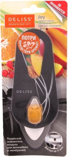 В данный момент этот товар отсутствует в продаже. Возможно, у нас найдется аналогичный или похожий товар здесь. Серия: Joy Подвесной освежитель воздуха Deliss Joy - фруктовый, сладкий, игривый. Испаряясь под действием потока воздуха, утонченные ароматы наполнят ваш автомобиль ароматом бодрящих фруктов. Аромат манго, апельсина, красной смородины.