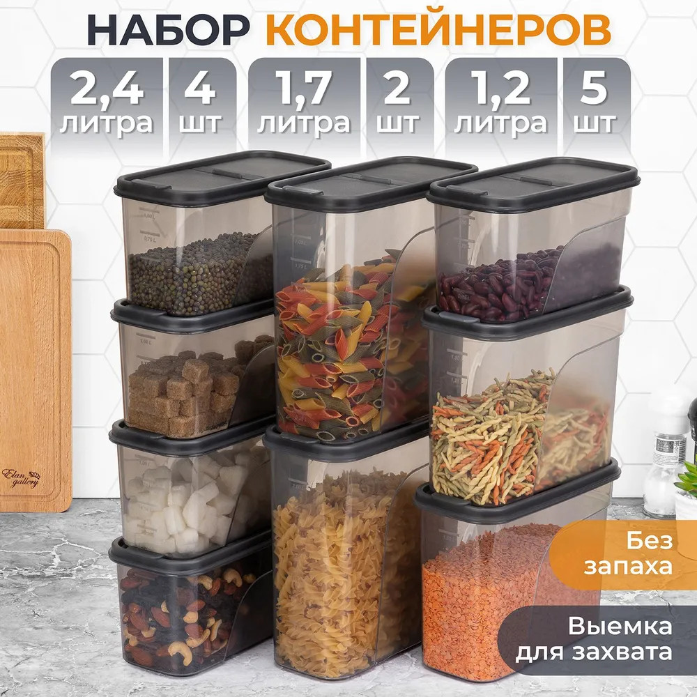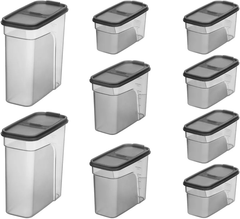 Набор из девяти контейнеров Elan Gallery обеспечит защиту сыпучих продуктов от влаги и других внешних факторов. Пластиковые контейнеры — идеальная ёмкость для хранения макарон, круп или специй. Также на кухне в баночки можно насыпать кофе или чай. Подойдут для хранения корма для домашних животных. Герметичные крышки обеспечивают надежное и долгосрочное хранение продуктов, сохраняя их свежесть и аромат. Лотки из пластика также могут быть использованы как органайзеры для любых кухонных вещей и мелочей. Эргономичная форма позволяет разместить их в шкафу или на полке, а также хранить друг на друге. Набор контейнеров можно использовать в ванной для хранения стирального порошка под раковиной или в ящике. Эти пищевые контейнеры станут незаменимыми помощниками для организации порядка на вашей кухне или в столовой!
