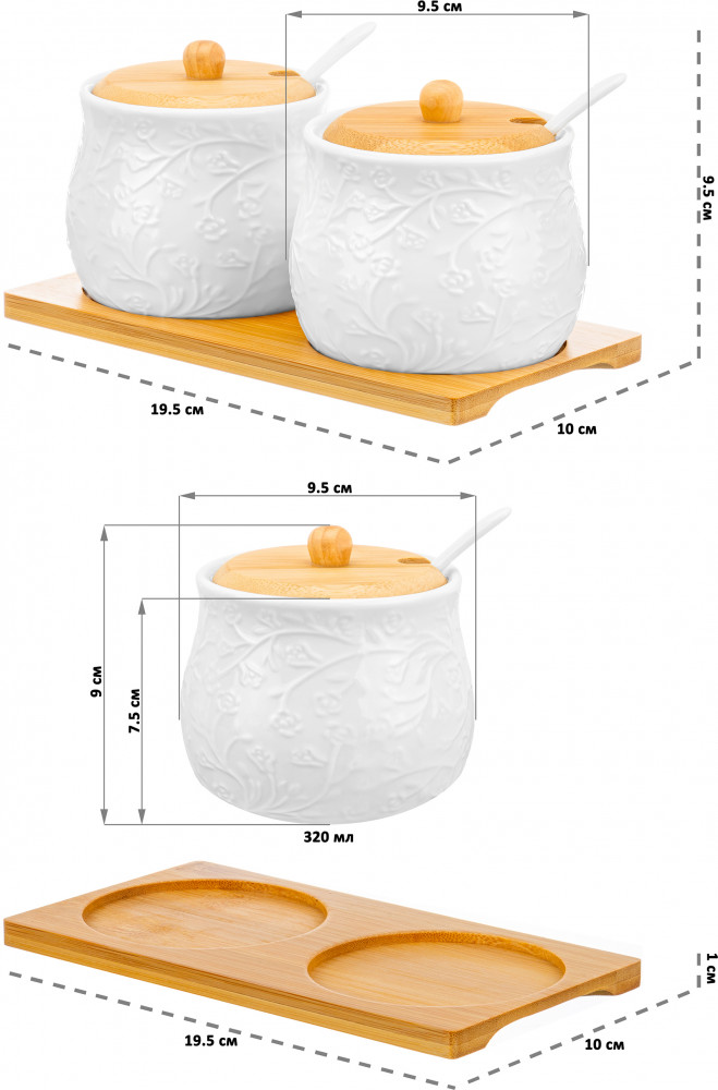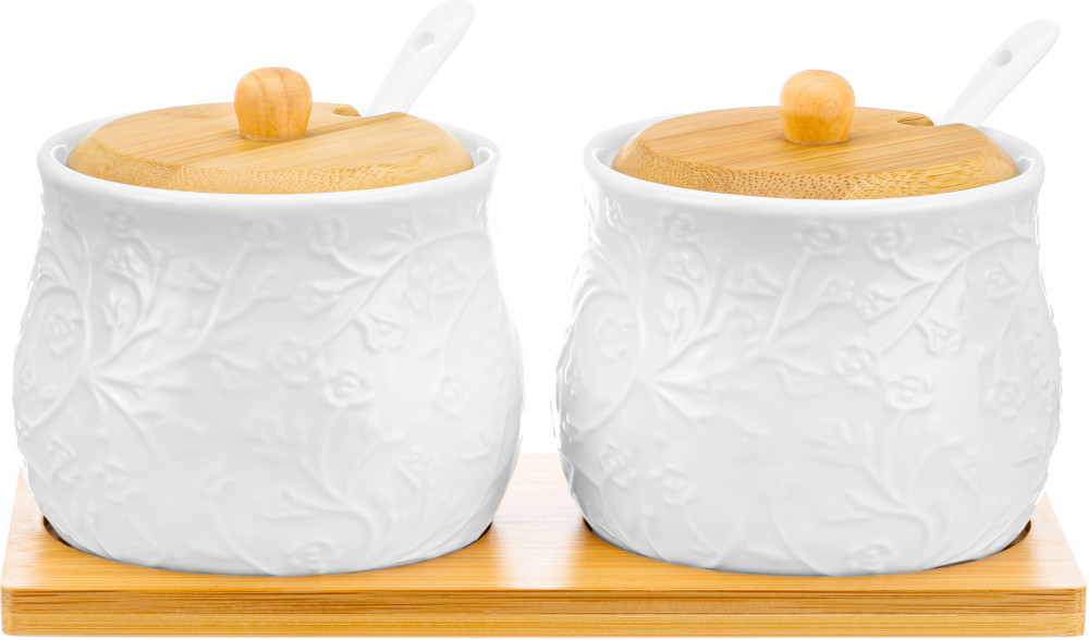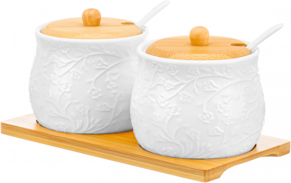 Elan Gallery Набор банок для продуктов «Веточки-цветочки»В данный момент этот товар отсутствует в продаже. Возможно, у нас найдется аналогичный или похожий товар здесь. Серия: Веточки-цветочки Набор из двух банок для хранения Elan Gallery «Веточки-цветочки» на бамбуковой подставке станет украшением вашей кухни. Ёмкости выполнены из белого фарфора и украшены рельефными узорами. Каждая баночка имеет крышку из бамбука и фарфоровую ложку. Можно использовать для сахара, соли и любых сыпучих продуктов. Подойдут для сервировки мёда, варенья или джема. Баночки помогут не только держать все продукты под рукой, но и украсят стол или полку на кухне. В банках можно хранить специи, приправы или соусы. Не рекомендуется применять абразивные моющие средства. Фарфоровые детали набора можно использовать в микроволновой печи и посудомоечной машине. Бамбук нельзя замачивать! Поставляется в стильной картонной упаковке. Банки для хранения «Веточки-цветочки» станут украшением любой кухни, вы можете использовать каждую как солонку, сахарницу, медовницу или хранить в них любые продукты. |