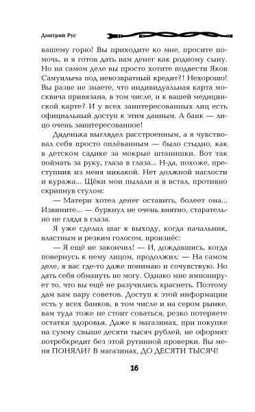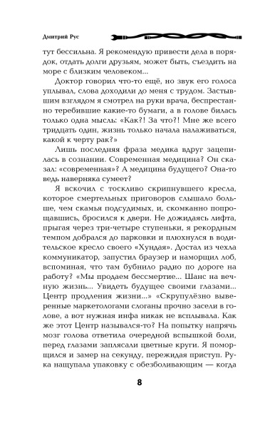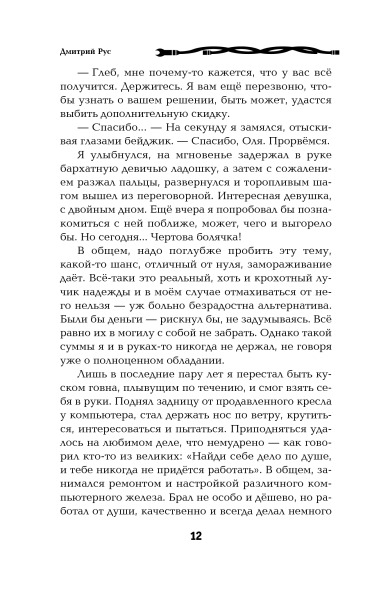 "Что наша жизнь? Игра!" В этом смертельно больному тридцатилетнему компьютерщику Глебу пришлось убедиться на своей шкуре. Игра «Друмир» перестала быть просто игрой, когда сознание первого игрока отделилось от его тела и навсегда поселилось на просторах жестких дисков игрового сервера. Она стала вторым шансом для тех, кто не хотел или не мог жить в нашем мире. И никто не возьмется судить брошенного на произвол судьбы инвалида или смертельно больного человека за то, что он выбрал бессмертие и новую жизнь, бросив здесь бренную оболочку. Да и положа руку на сердце – многие согласились бы обменять серые постылые будни на посох мага, меч воина или штурвал звездолета и стать кем-то другим, хотя бы на время. Книгу Дмитрия Руса я обнаружил на просторах интернета чисто случайно, увидев в блогах разговор двух восхищенных читателей, и из чистого любопытства решил взглянуть, хотя к попаданцам откуда-то куда-то, коих несть числа на нынешнем книжном рынке, я отношусь с огромным сарказмом за вторичность, за роялизм, за несуесветную тупость персонажей. Однако нельзя не признать, что в тоннах пустой руды, очень редко, но можно найти золотые самородки. И это оказался именно тот случай. Книга резко цепляет с первых строк и увлекает за собой. Автор некогда ране не публиковавшийся, что конечно не главный показатель, но один из них, сумел создать красивый и непротиворечивый мир, мир в котором интересно жить даже людям, которые ни разу в жизни не слышали слов «лут» или «моб». Автор умело ведет параллельно сразу несколько сюжетных линий, как рассказ о приключениях темного эльфа Лаита, так и намеки на игру больших шишек, которые явно не хотят оставлять без внимания такой лакомый кусочек как «Друмир» и прочие витрмиры, резко ставшие реальностью, причем для многих неприятной и неожиданной. Автор умело ведет читателя по хитросплетениям сюжета, умело нагнетая саспенс и не забывая добавить четко отмеренную долю юмора именно там где это необходимо для разрядки сюжетного напряжения. Автор не опускается до разжевывания всего и вся, а предоставляет читателю право думать самому. Книга не перегружена игровой тематикой и не превращается в фанфик по мотивам MMORPG, игра там полноправный частник сюжета, но к счастью не главный. Если обратиться к недостаткам – то обнаруживается забавная вещь. Их не то, чтобы нет, но они оказываются либо продолжением достоинств, либо же вытекают из логики мира и сюжета. В частности немного раздражает рояльная везучесть героя, но потом становится понятно, что это не он такой везучий. Просто он, как и любой другой избранный, должен безропотно надеть синий костюмчик с желтой цифрой и отправиться сотрясать основы мира, и уже даже неважно какого уровня игрок который его ведет. Книга Дмитрия Руса заслуживает искренней похвалы, причем безо всяких скидок на пробу новичка. Единственно, от чего хочется предостеречь автора, что погубило многие прекрасные миры, – это вовремя закрыть одну дверь и открыть другую. Дверь которая тоже будет вести в новый мир.