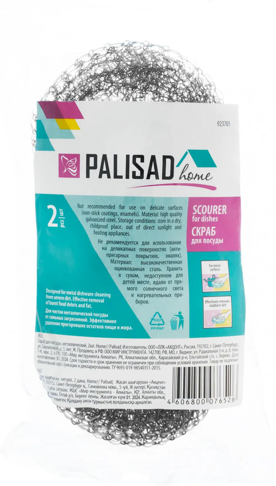 Металлический скраб для посуды Palisad Home используется в бытовых целях. С его помощью можно удалить старую и въевшуюся грязь, засохший жир, налет ржавчины. Он станет идеальным помощником при очищении не только посуды, но и противней, плит, раковин и кафельной плитки.