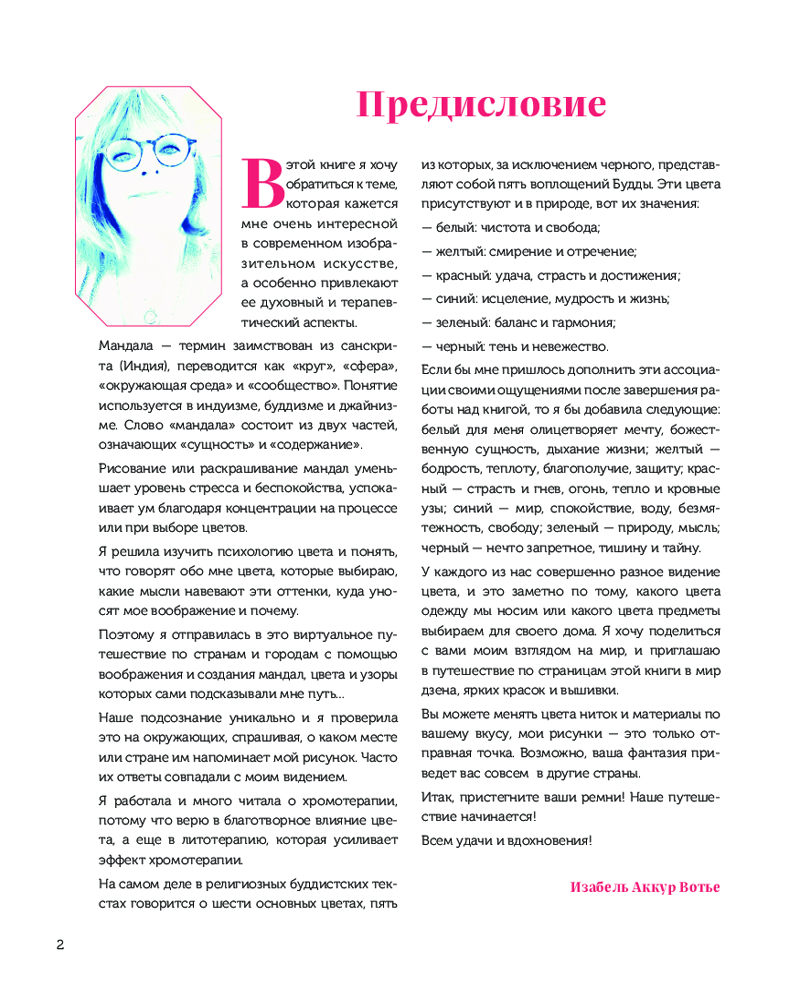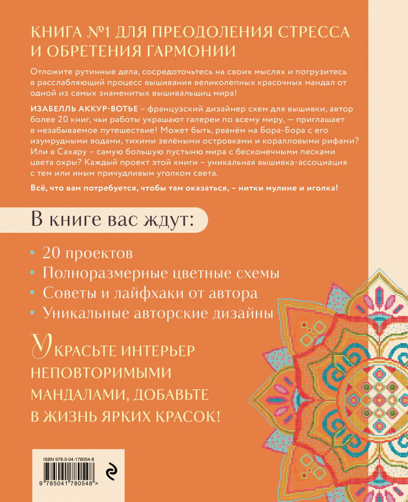 💳 Оплатить за товар можно при получении 🇰🇿 Есть бесплатная доставка по Казахстану от 1 дня 🎁 Копите бонусы с каждой покупки Серия: Шедевры мировой вышивки Книга № 1 для избавления от стресса и обретения гармонии от знаменитого французского дизайнера Изабель Аккур-Вотье! Мандалы издавна считают символами гармонии, уходящими своими корнями в восточные религиозные практики. В древнем индийском языке «мандала» переводится как «круг, центр», олицетворяя величественную Вселенную. Вышивая мандалы, мы обретаем внутреннее равновесие, спокойствие и боремся со стрессом. Откройте для себя фантастический мир вышитых мандал и почувствуйте волшебство гармонии! |