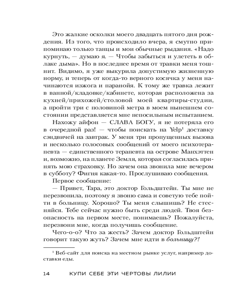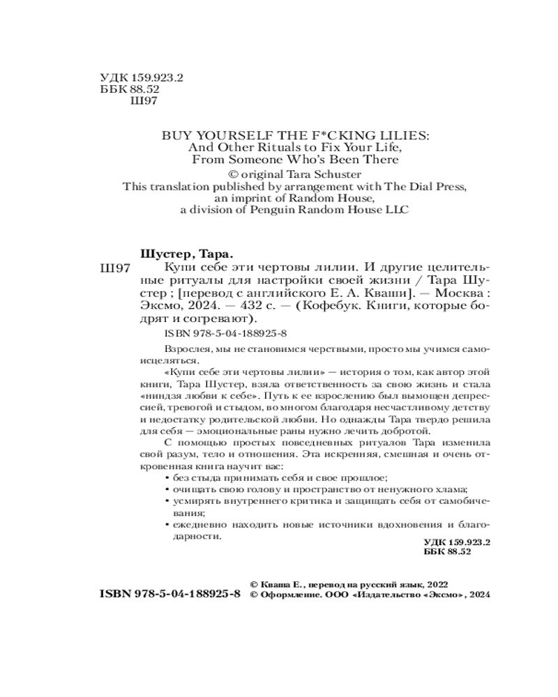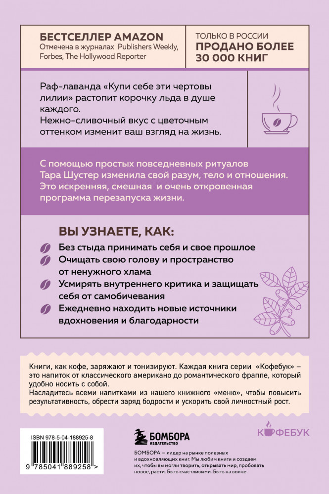 💳 Оплатить за товар можно при получении 🇰🇿 Есть бесплатная доставка по Казахстану от 1 дня 🎁 Копите бонусы с каждой покупки Серия: Кофебук. Книги которые бодрят и согревают Полюбите цветочный оттенок и сливочный вкус текста «Купи себе эти чертовы лилии». Взрослея, мы не становимся черствыми, просто мы учимся самоисцеляться. Эта книга для тех, чья душа покрыта корочкой льда. Для тех, кто прячется от настоящего себя в бессмысленной суете и поверхностных отношениях. Для тех, кто живет с закрытыми глазами, одинаково опасаясь смотреть как в будущее, так и в прошлое. |