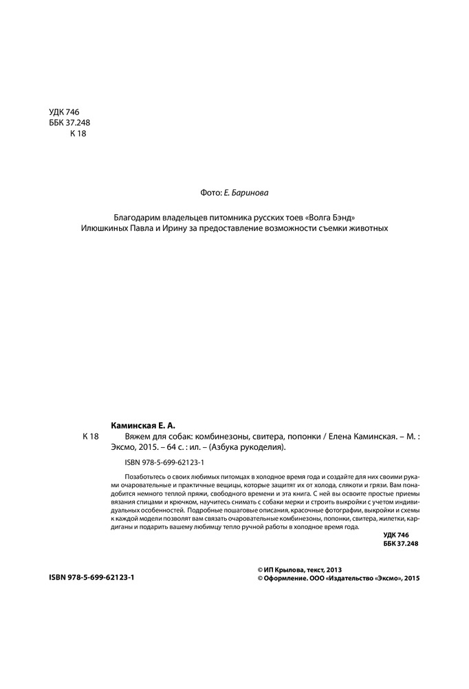 Вяжем для собак: комбинезоны, свитера, попонкиВ данный момент этот товар отсутствует в продаже. Возможно, у нас найдется аналогичный или похожий товар здесь. Серия: Азбука рукоделия Позаботьтесь о своих любимых питомцах в холодное время года и создайте для них своими руками очаровательные и практичные вещицы, которые защитят их от холода, слякоти и грязи. Вам понадобится немного теплой пряжи, свободного времени и эта книга. С ней вы освоите простые приемы вязания спицами и крючком, научитесь снимать с собаки мерки и строить выкройки с учетом индивидуальных особенностей. Подробные пошаговые описания, красочные фотографии, выкройки и схемы к каждой модели позволят вам связать очаровательные комбинезоны, попонки, свитера, жилетки, кардиганы и подарить вашему любимцу тепло ручной работы в холодное время года. |