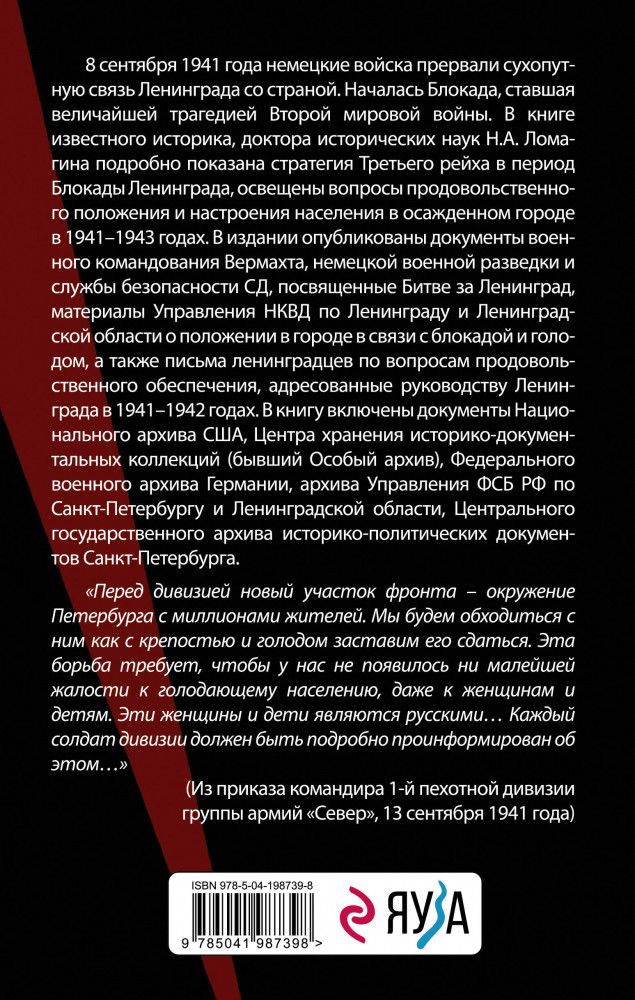💳 Оплатить за товар можно при получении 🇰🇿 Есть бесплатная доставка по Казахстану от 1 дня 🎁 Копите бонусы с каждой покупки Серия: Блокада Ленинграда. Воспоминания 8 сентября 1941 года немецкие войска прервали сухопутную связь Ленинграда со страной. Началась Блокада, ставшая величайшей трагедией Второй мировой войны. В книге известного историка, доктора исторических наук Н.А. Ломагина подробно показана стратегия Третьего рейха в период Блокады Ленинграда, освещены вопросы продовольственного положения и настроения населения в осажденном городе в 1941–1943 годах. В издании опубликованы документы военного командования Вермахта, немецкой военной разведки и службы безопасности СД, посвященные Битве за Ленинград, материалы Управления НКВД по Ленинграду и Ленинградской области о положении в городе в связи с блокадой и голодом, а также письма ленинградцев по вопросам продовольственного обеспечения, адресованные руководству Ленинграда в 1941–1942 годах. В книгу включены документы Национального архива США, Центра Хранения Историко-Документальных Коллекций (бывший Особый Архив), Федерального военного архива Германии, архива Управления Федеральной Службы Безопасности РФ по Санкт-Петербургу и Ленинградской области, Центрального государственного архива историко-политических документов Санкт-Петербурга. |