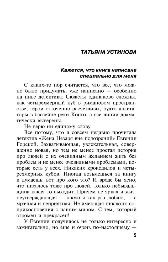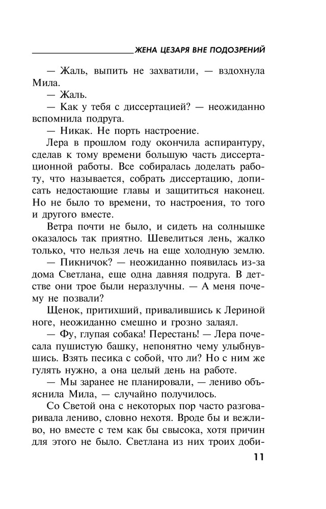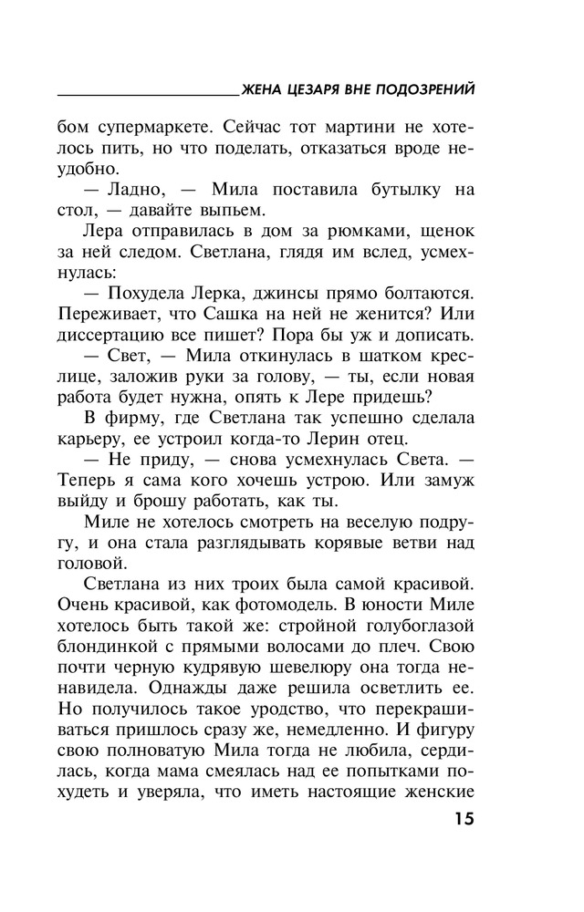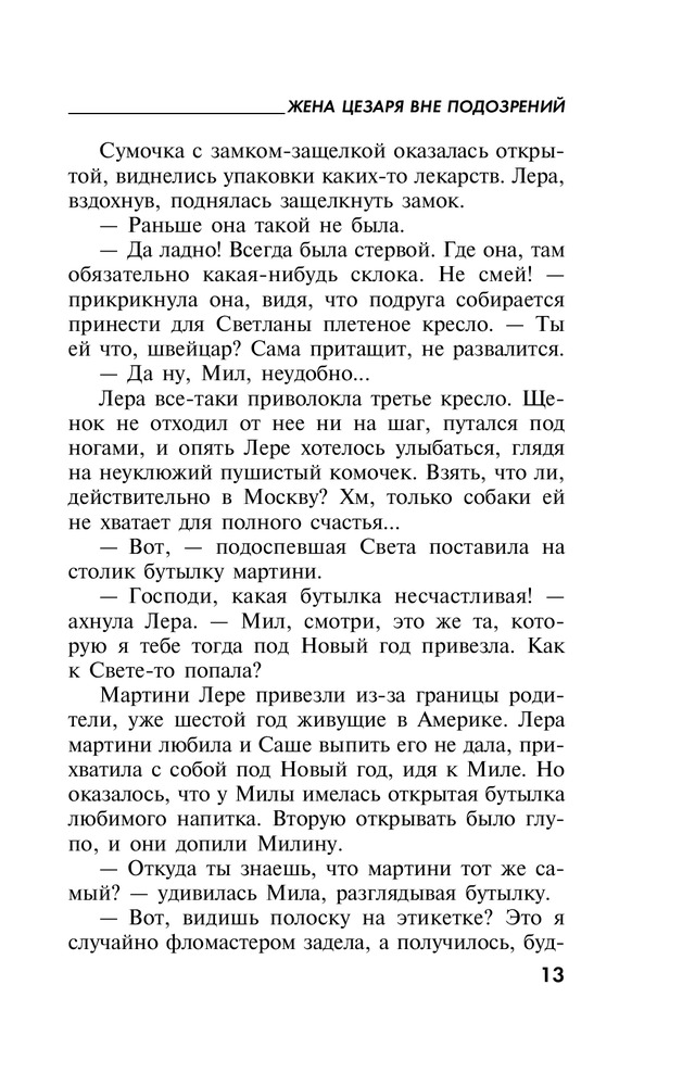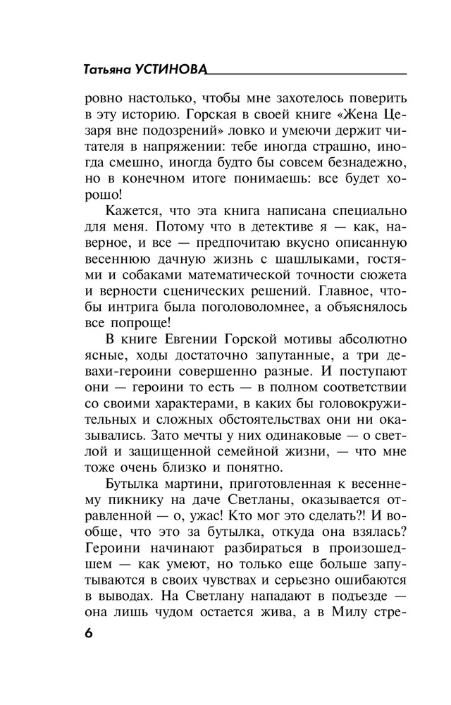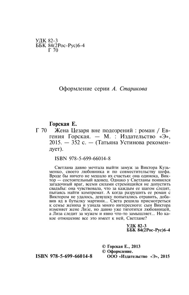 Жена Цезаря вне подозренийВ данный момент этот товар отсутствует в продаже. Возможно, у нас найдется аналогичный или похожий товар здесь. Серия: Татьяна Устинова рекомендует Светлана давно мечтала выйти замуж за Виктора Кузьменко, своего любовника и по совместительству шефа. Вроде бы, ничего не мешало их счастью: она одинока, Виктор — состоятельный вдовец. Однако у Светланы появился загадочный враг, всеми силами стремящийся не допустить свадьбы: она чувствовала, что за каждым ее шагом следят, пытаясь найти компромат. А когда разрушить ее роман с Виктором не удалось, девушку попытались отравить, добавив яд в бутылку мартини… Света решила присмотреться к семье жениха и узнала много интересного: сын Виктора изменяет жене Лизе, но давно уже тяготится любовницей, а Лиза следит за мужем и явно что-то замышляет…. Но какое отношение все это имеет к ней, Светлане? |