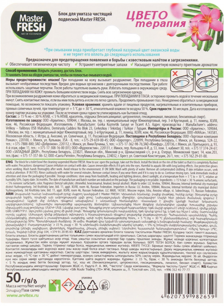 Master Fresh Блок для унитаза «Синяя вода»В данный момент этот товар отсутствует в продаже. Возможно, у нас найдется аналогичный или похожий товар здесь. Серия: Gold Предлагаемый нами подвесной блок на унитаз торговой марки Master FRESH, оснащенный чудодейственными средствами для туалета, гарантирует приятный и стойкий аромат, который окутает вашу уборную непревзойденной свежестью. Благодаря его уникальной формуле, обильная пена будет аккуратно и эффективно очищать ваш унитаз при каждом смывании. Подвесной блок не только придает вашему унитазу сияющую поверхность, но и действует профилактически против известковых отложений. Просто представьте себе, насколько легко будет поддерживать чистоту в вашем туалете с помощью этого волшебного средства. Однако, обширные возможности блока на унитаз не ограничиваются только чистотой. При смывании вода приобретает глубокий лазурный цвет океанской волны и не теряет его вплоть до следующего использования. Высокие и устойчивые показатели пенообразования и ароматики. Средство предназначено для предотвращения появления и борьбы с известковым налётом и загрязнениями. Обеспечивает гигиеническую чистоту; устраняет неприятные запахи; насыщает туалетную комнату приятным ароматом. Комплексный подход к чистоте туалетной комнаты «6 в 1»: цветная вода, гигиена, антиналёт, аромат, свежесть, блеск. |