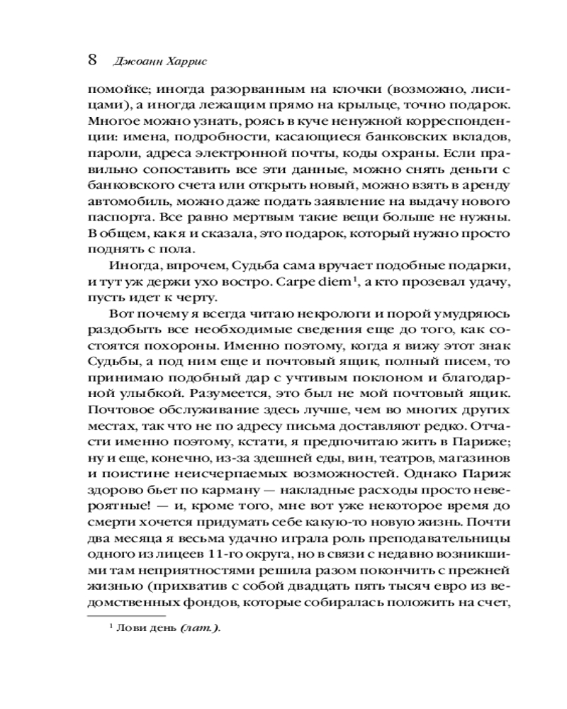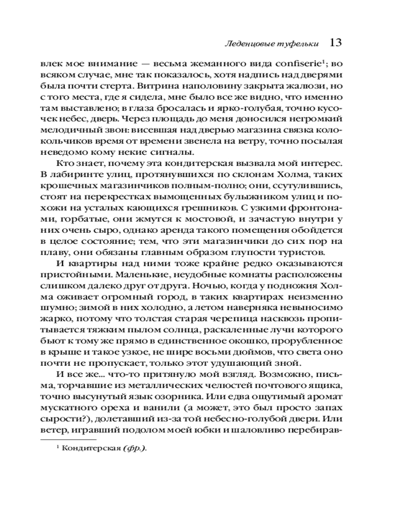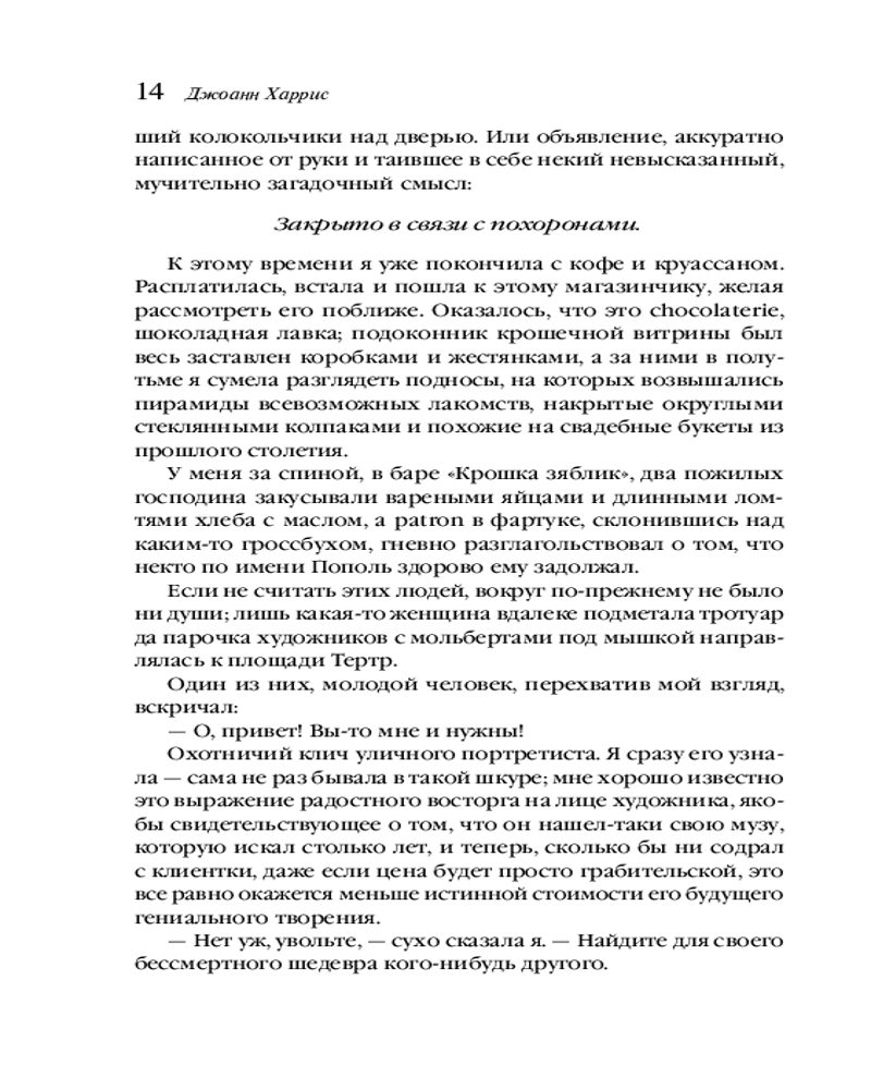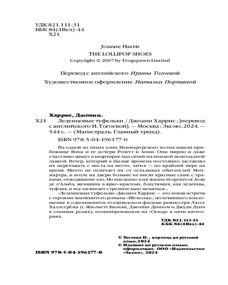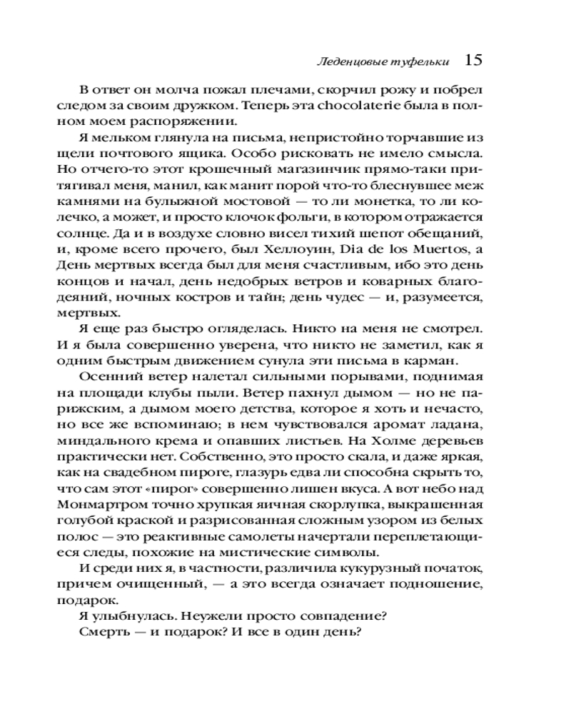 💳 Оплатить за товар можно при получении 🇰🇿 Есть бесплатная доставка по Казахстану от 1 дня 🎁 Копите бонусы с каждой покупки Серия: Магистраль. Главный тренд На одной из тихих улиц Монмартрского холма нашли прибежище Вианн и ее дочери Розетт и Анни. Они мирно и даже счастливо живут в квартирке над своей маленькой шоколадной лавкой. Ветер, который в былые времена постоянно заставлял их переезжать с места на место, затих — по крайней мере, на время. Ничто не отличает их от остальных обитателей Монмартра, и возле их двери больше не висят красные саше с травами, отводящими зло. Но внезапно в их жизнь вторгается Зози де л’Альба, женщина в ярко-красных, блестящих, как леденцы, туфлях, и все начинает стремительно меняться... |