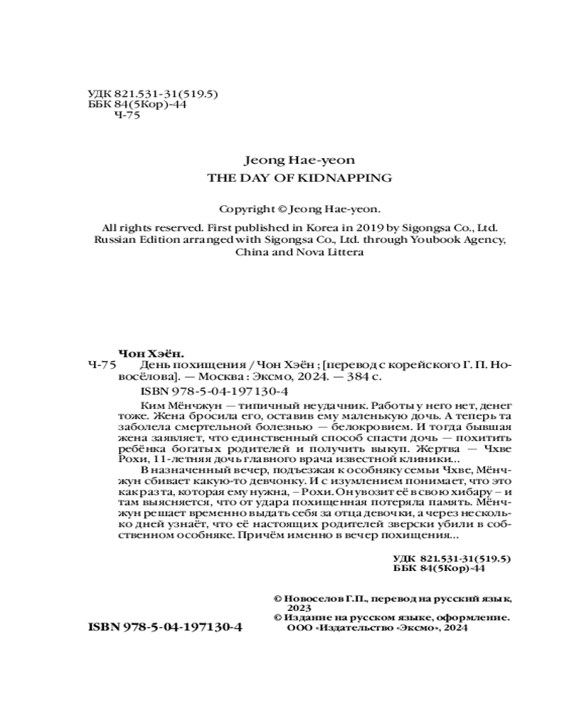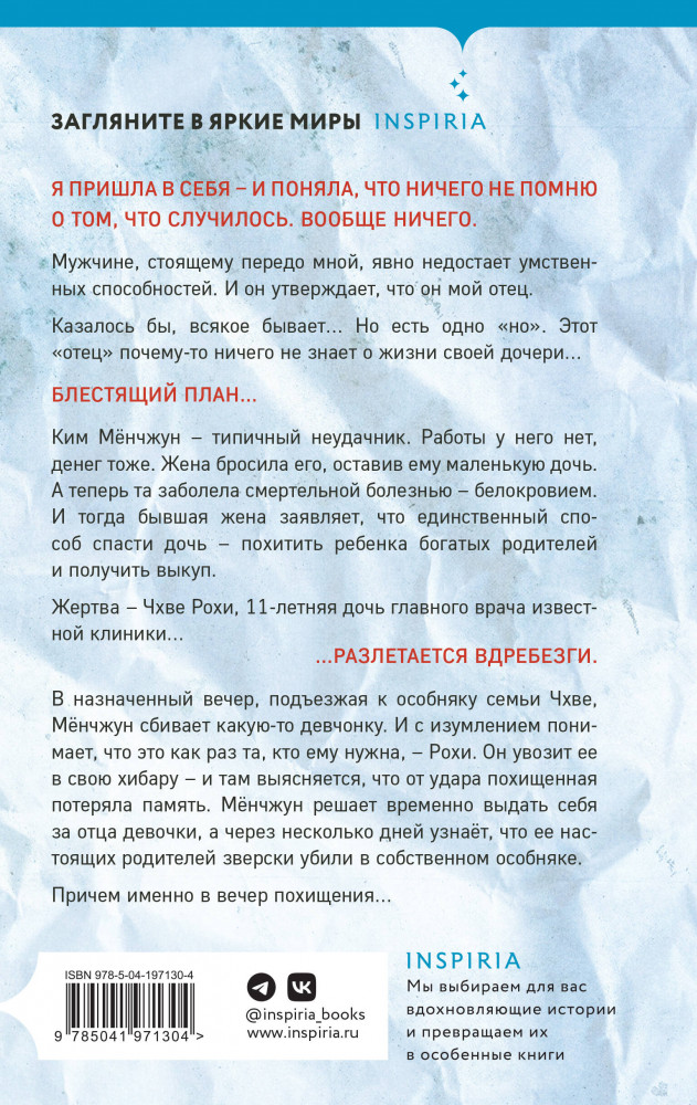 Серия: Дорама-триллер. Экранизированные бестселлеры из Кореи Я пришла в себя — и поняла, что ничего не помню о том, что случилось. Вообще ничего. Мужчине, стоящему передо мной, явно недостает умственных способностей. И он утверждает, что он мой отец. Казалось бы, всякое бывает... Но есть одно «но». Этот «отец» почему-то ничего не знает о жизни своей дочери...