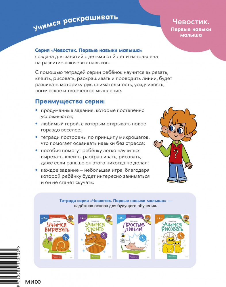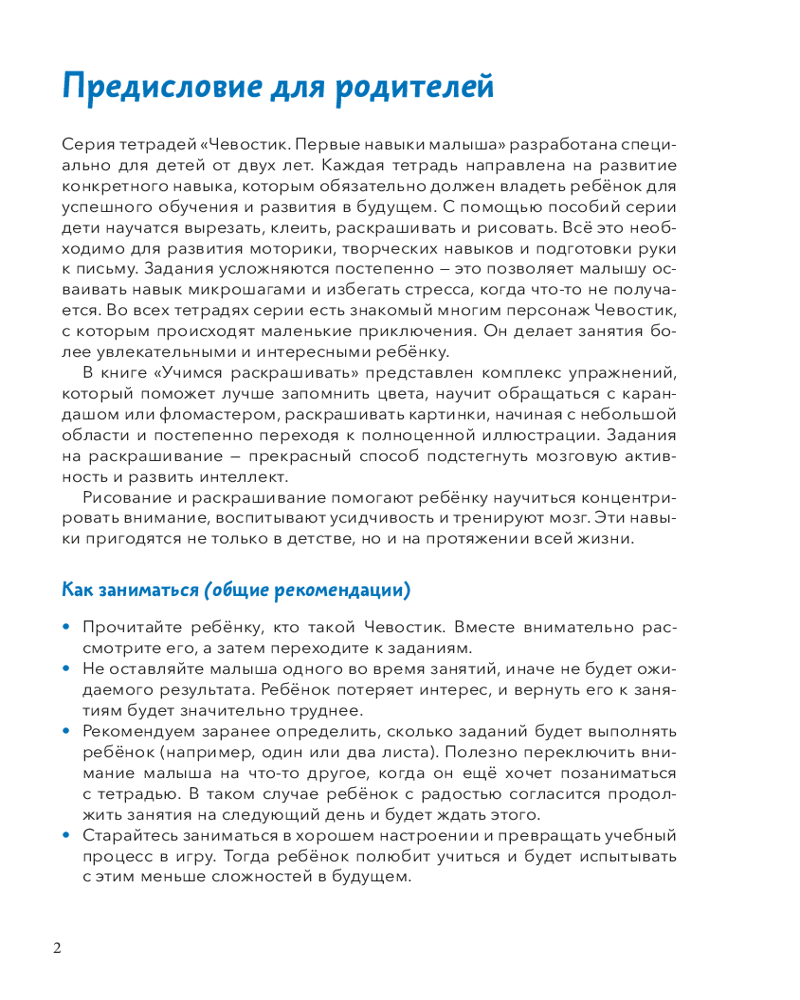 Серия: Чевостик. Первые навыки малыша Благодаря тетради «Учимся раскрашивать» ребёнок запомнит цвета, научится обращаться с карандашом или фломастером, раскрашивать картинки аккуратно. Задания на раскрашивание подстегнут мозговую активность, разовьют интеллект, мелкую моторику и усидчивость, помогут ребёнку научиться концентрировать внимание.
