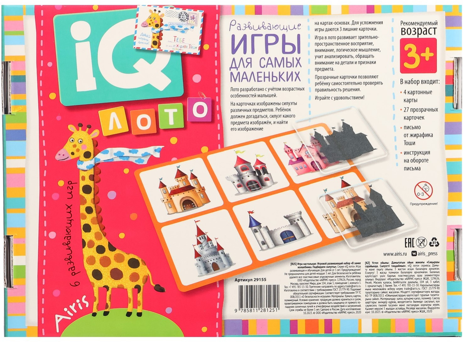 Серия: IQ пластиковое лото Лото разработано с учётом возрастных особенностей малышей. Необычная тема сказочного праздника и волшебного чаепития в замке расширит лексику ребёнка. Специальный подбор картинок научит обобщать и анализировать, заложит основы структурного мышления. Основной принцип игры — «Подбери силуэт». Лото поможет в развитии зрительного восприятия, внимания и пространственного мышления. Прозрачные карточки позволят ребёнку самому экспериментировать и проверять правильность решения. |