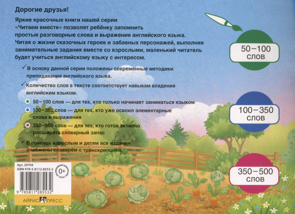 💳 Оплатить за товар можно при получении 🇰🇿 Есть бесплатная доставка по Казахстану 🎁 Копите бонусы с каждой покупки Серия: Читаем вместе Известная сказка о хитром Братце Кролике, его маленьких крольчатах и коварном Братце Лисе адаптирована специально для детей. Прочитав эту книгу, ваш ребёнок познакомится с повелительным наклонением, научится употреблять глаголы в 3-м лице единственного числа в Present Simple, а также пополнит свой словарный запас. В конце книги даны занимательные упражнения, составленные с учётом новейших методик преподавания английского языка в раннем возрасте. Их выполнение поможет ребёнку легко усвоить языковой материал для дальнейшего развития необходимых навыков и умений. Завершает книгу англо-русский словарь, где в алфавитном порядке собраны все новые слова с транскрипцией. |