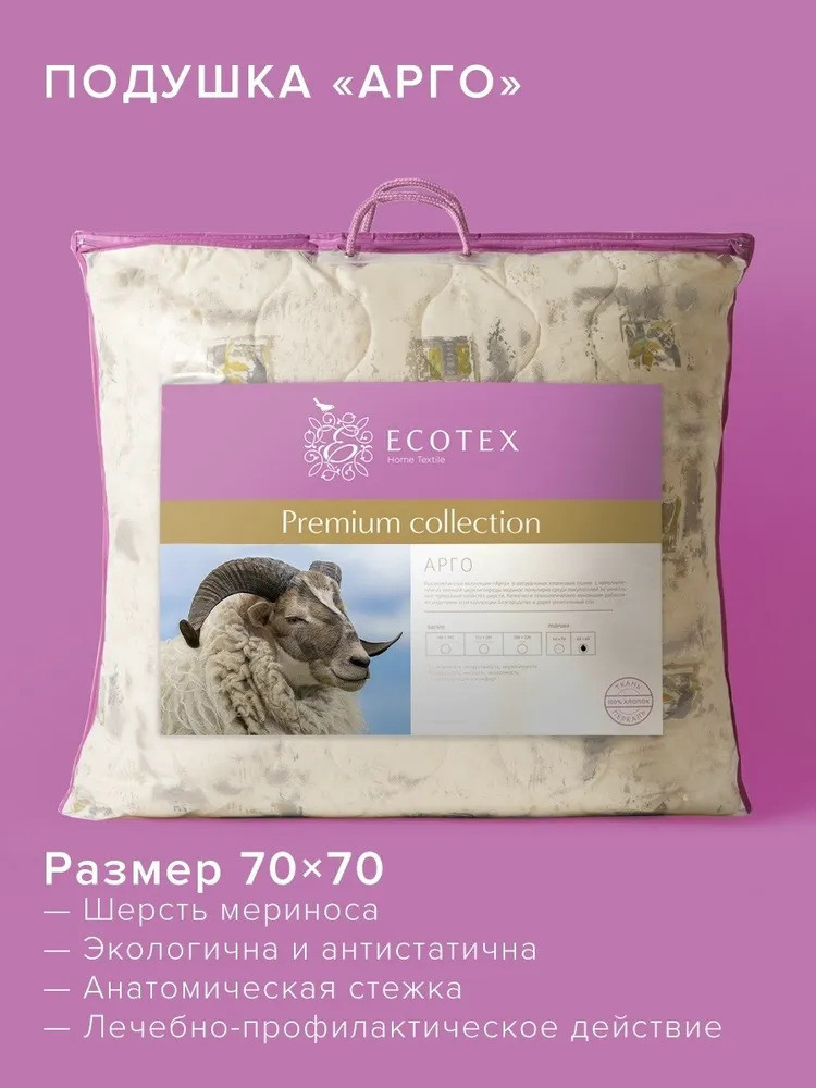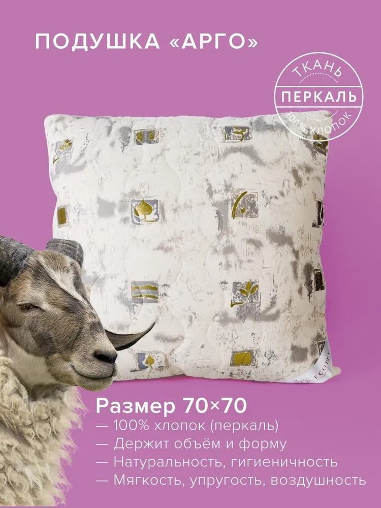 Анатомическая стежка чехла подушки значительно увеличивает срок службы изделия и создает дополнительный комфорт. Остальной объём подушки занимает высокосиликонизированное микроволокно DownFill, называемое «синтетическим пухом» — волокном нового поколения. Подушка «Арго» в 100% хлопковой ткани перкале, из овечьей шерсти породы меринос торговой марки Ecotex изготавливаются на собственной высокотехнологичной фабрике с соблюдением контроля качества изделия и материалов и упаковано в стильный дизайнерский чемодан. Коллекция подушек «Арго» — качество, комфорт, благородство и наслаждение полноценным отдыхом.