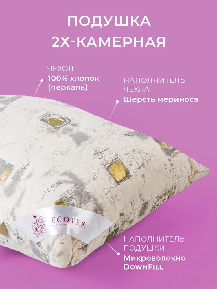 Хотите приобрести качественную подушку из натуральных материалов? Высококлассная комбинированная подушка «Арго» с наполнителем из овечьей шерсти породы меринос в стеганом чехле из перкаля, приятной на ощупь 100% хлопковой ткани, создана именно для Вас. Она обеспечивает хорошую поддержку шеи и головы во время сна, практична, экологична и комфортна. Качество и технологические инновации добавляют изделиям этой коллекции благородство и дарят упоительный сон.