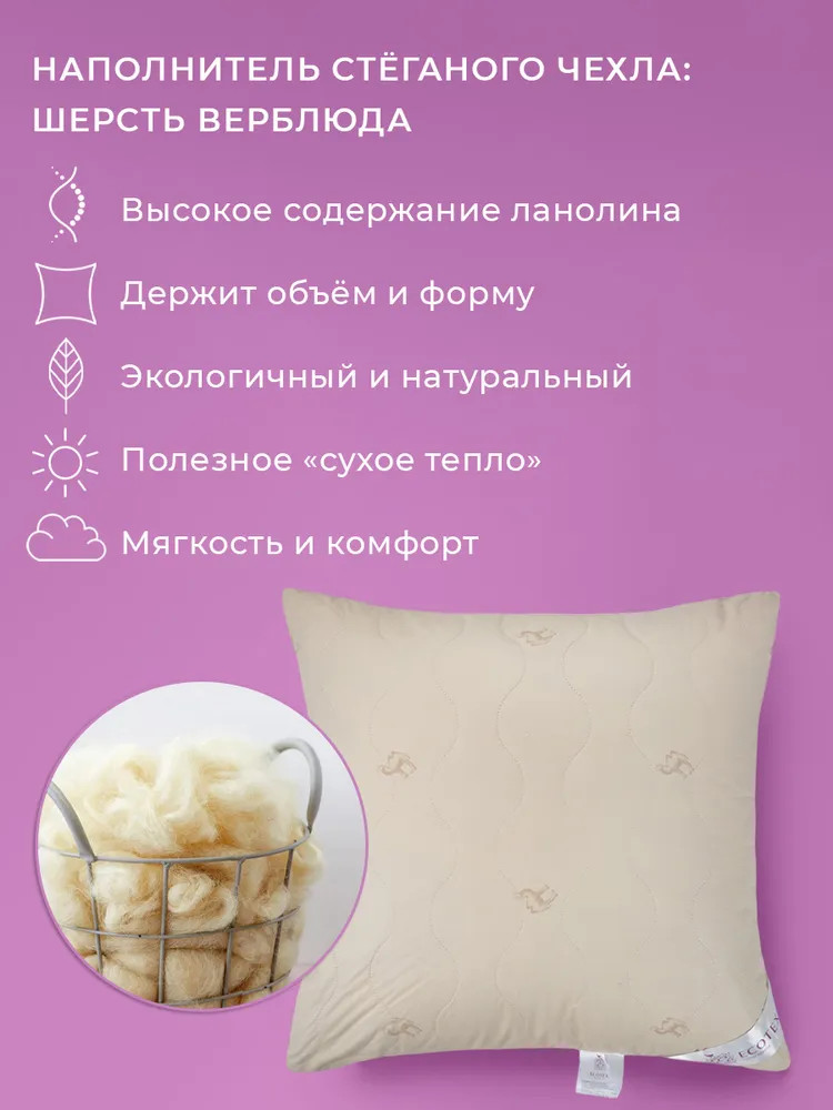 Особенности шерстяной подушки «Караван»: наличие чехла из 100% хлопковой ткани тика и наполнитель из верблюжьей шерсти. Чехол подушки от Ecotex, изготовленный из плотного хлопка-тика, обеспечивает высокую износостойкость и долгий срок службы изделия. Тик — это плотный и прочный материал, надежно удерживающий внутри чехла наполнитель, не пропуская жесткий волос верблюжьей шерсти. Тик довольно гладкий на ощупь, но совсем не скользит, что очень важно для чехлов подушек и одеял. Анатомическая стежка чехла подушки значительно увеличивает срок службы изделия и создает дополнительный комфорт. Остальной объём подушки занимает высокосиликонизированное микроволокно DownFill, называемое «синтетическим лебяжьим пухом» — волокном нового поколения.