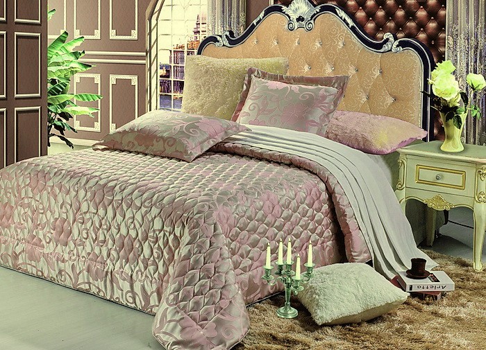 На фото фон как будто золотистым отливает, на самом деле фон бледно-розовый, цветы нашиты, и по краю покрывала вшит симпатичный шнурок. Но мне кажется не будет так отражать свет как на фото. Обратная сторона и покрывала и наволочек не жаккард, ну про покрывало понятно, хотя на фото загнутый угол тоже из жаккарда, а наволочки все таки думала будут с обеих сторон жаккардовые.