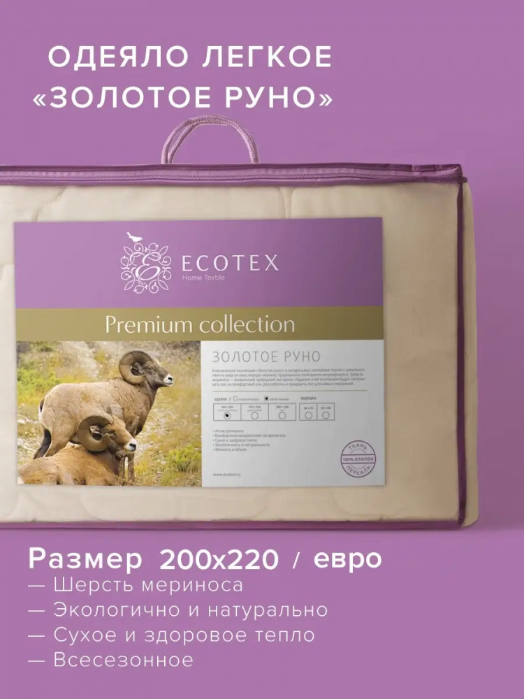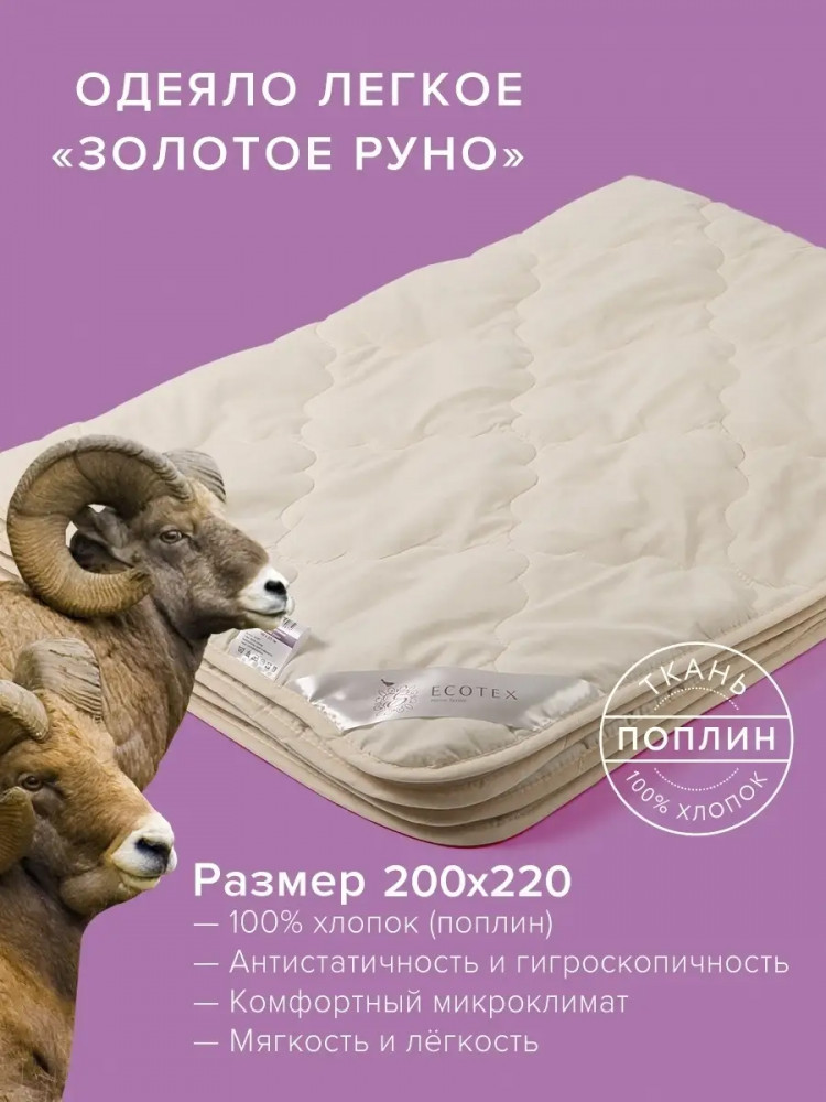 Одеяло «Золотое руно» торговой марки Ecotex в 100% хлопковой ткани, из овечьей шерсти породы меринос изготавливается на собственном высокотехнологичном производстве с соблюдением контроля качества и упакованы в фирменный стильный чемодан. Анатомическая стежка изделия позволяет добиться высокой степени комфорта и значительно увеличить срок службы одеяла.
