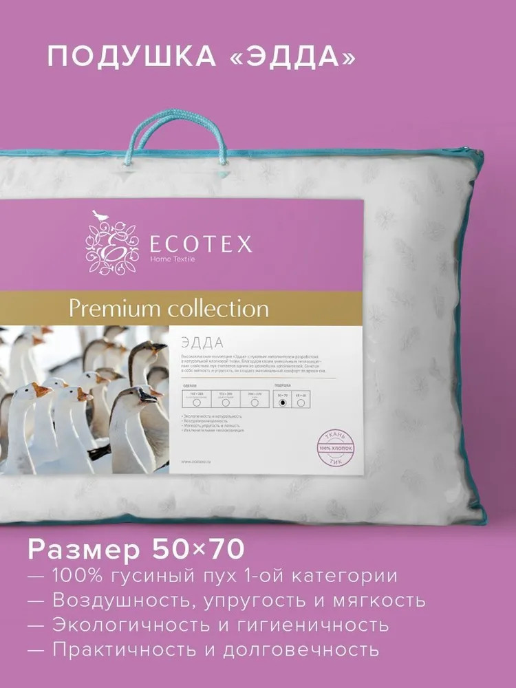 Высококлассная пуховая подушка «Эдда» от Ecotex с пуховым наполнителем 1-й категории в 100% хлопковом тике — это не роскошь, а обязательное условие хорошего сна. Подушки из пуха линии Премиум — это традиционный комфорт в высококачественном исполнении.