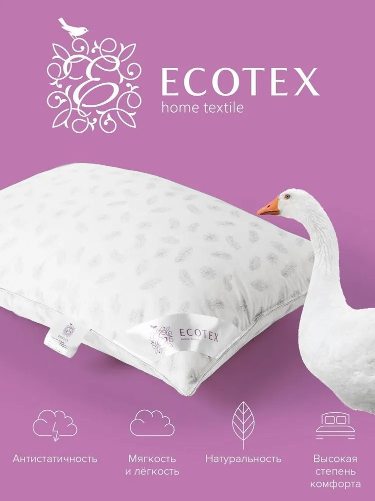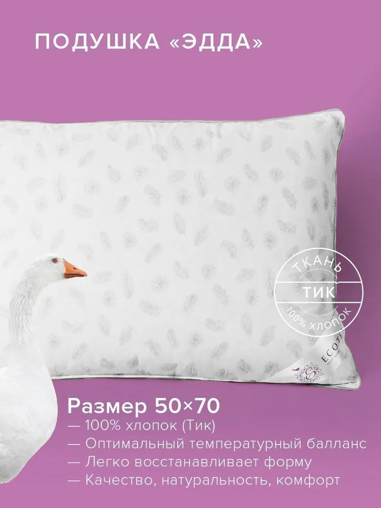 Традиционные пуховые подушки компании «Ecotex» — воздушные, нежные, взбитые в легкое облако — дарят удовольствие от их пышности и мягкости во время сна. При всей своей мягкости пух также обладает упругостью и эластичностью, может быстро восстанавливать форму. Изделия на основе пуха прекрасно поддерживают голову и шею спящего человека. Пуховая подушка «Эдда» от Ecotex — высокая, экологичная, упругая, для сна на боку и спине. Степень упругости: средняя.