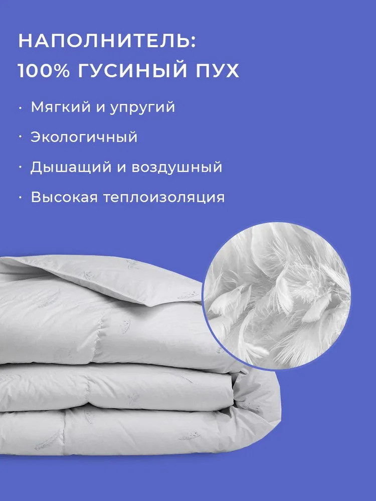 Гусиный пух — это дышащий наполнитель, который легко сжимается и принимает форму тела, обволакивая теплом как облако и естественным образом следуя его природному рельефу.