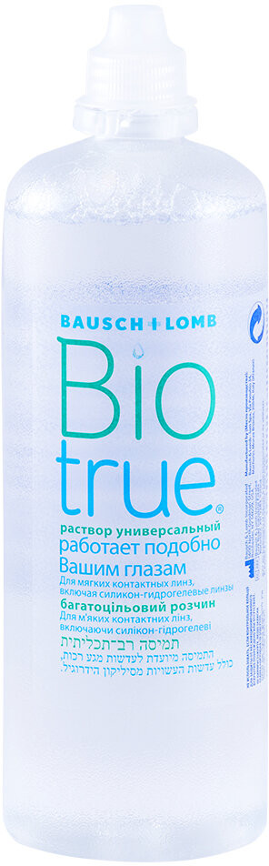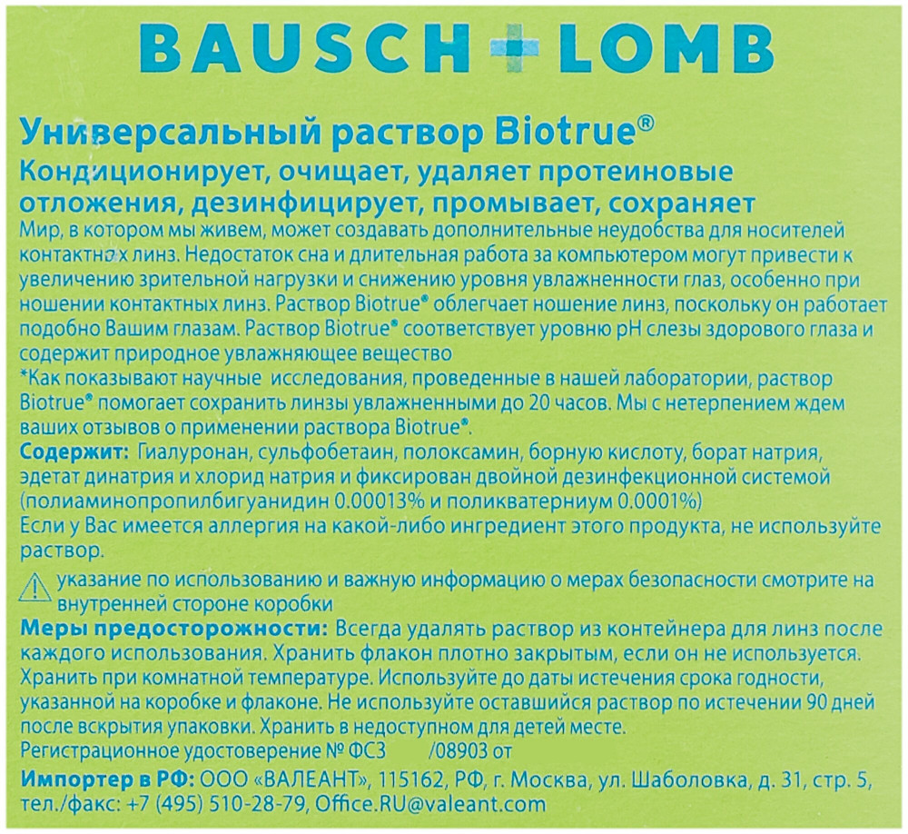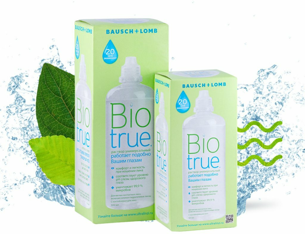 Дезинфекция осуществляется благодаря сочетанию двух активных компонентов — полиаминопропилбигуанида и поликватерниума, которые имеют широкий спектр действия, в том числе активны в отношении грамотрицательных бактерий, вызывающих инфильтраты роговицы. Сохраняя линзы увлажненными и чистыми, универсальный раствор Biotrue