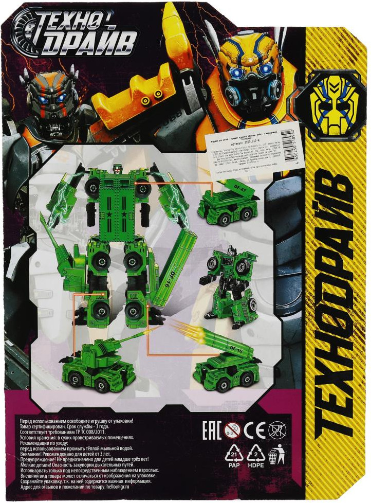 Технодрайв Робот-трансформерВ данный момент этот товар отсутствует в продаже. Возможно, у нас найдется аналогичный или похожий товар здесь. Серия: Супербот Этот яркий робот непременно понравится юному герою. Вместе с ним можно отправиться на спецзадание, спасти мир, стоять на страже правопорядка и придумать еще много сюжетов для занимательных игр. Ребёнок может играть с ним как с роботом, так и как с моделью военной техники. |