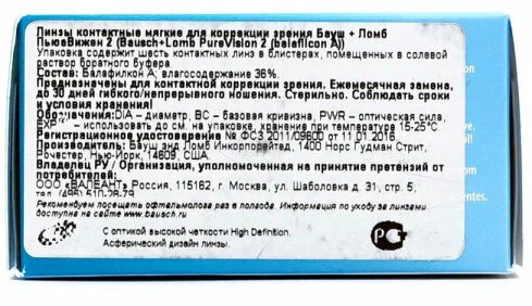 Линзы контактные мягкие для коррекции зрения Bausch & Lomb Pure Vision 2 (balafilcon A) предназначены для дневного или пролонгированного ношения от 1 до 30 дней, после которых производится снятие линз для их очистки, дезинфекции или замены в соответствии с рекомендациями специалиста по коррекции зрения. Линзы предназначены для коррекции рефракционной аметропии (миопии или гиперметропии) у афакичных и/или неафакичных пользователей без сопутствующей патологии глаз, с астигматизмом до 2,00 диоптрий, не оказывающим влияния на остроту зрения.