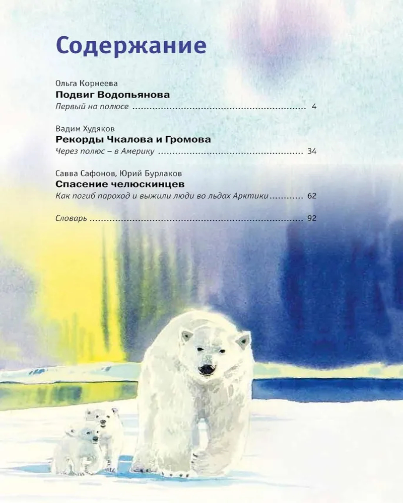 В этой книге мы расскажем историю спасения экипажа и пассажиров парохода «Челюскин» отважными пилотами и о трех знаменитых перелётах, которые в 1937 году совершили экипажи русских лётчиков под командованием Михаила Водопьянова, Валерия Чкалова и Михаила Громова. Водопьянов и его товарищи — впервые в истории человечества осуществила высадку на Северный полюс. Это были первые люди, которые действительно побывали на отметке 90 градусов северной широты. Валерии Чкалов и Михаил Громов первыми достигли Америки новым путём, пролетев над Северным полюсом. Громов при этом поставил ещё и рекорд дальности беспосадочного перелёта, преодолев 10 148 километров за 62 часа 17 минут. Эти истории вошли в летопись освоения Арктики как величайшие подвиги советских людей. Весь мир восхищался полярными лётчиками, совершившими то, что казалось невозможным.