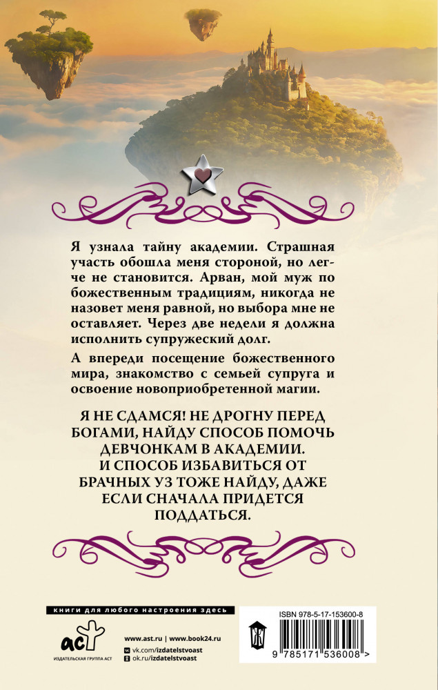 💳 Оплатить за товар можно при получении 🇰🇿 Есть бесплатная доставка по Казахстану от 1 дня 🎁 Копите бонусы с каждой покупки Серия: Звезды романтического фэнтези Я узнала тайну академии. Страшная участь обошла меня стороной, но легче не становится. Арван, мой муж по божественным традициям, никогда не назовет меня равной, но выбора мне не оставляет. Через две недели я должна исполнить супружеский долг. А впереди посещение божественного мира, знакомство с семьей супруга и освоение новоприобретенной магии. Я не сдамся! Не дрогну перед богами, найду способ помочь девчонкам в академии. И способ избавиться от брачных уз тоже найду, даже если сначала придется поддаться. |