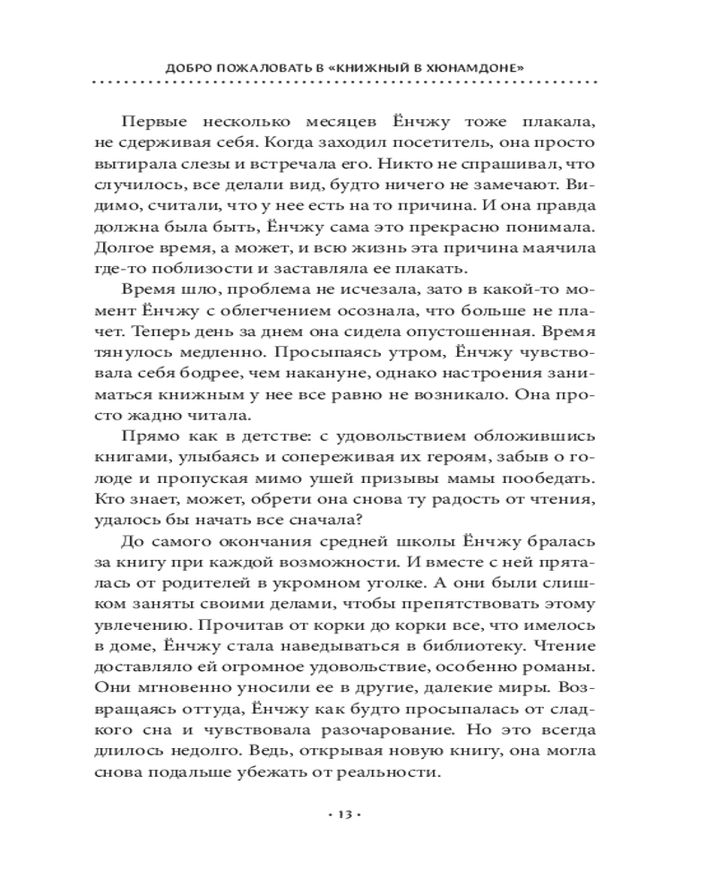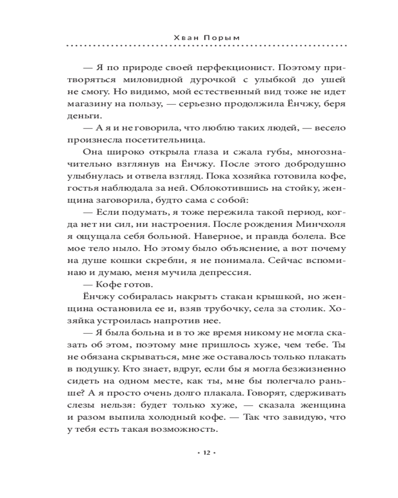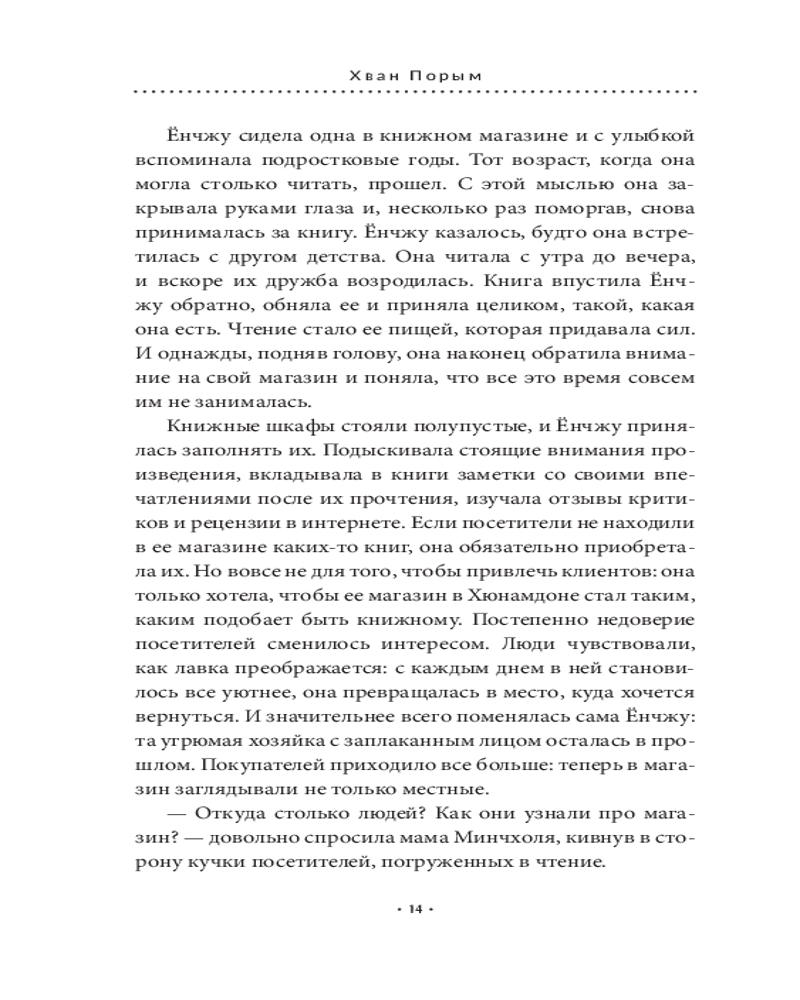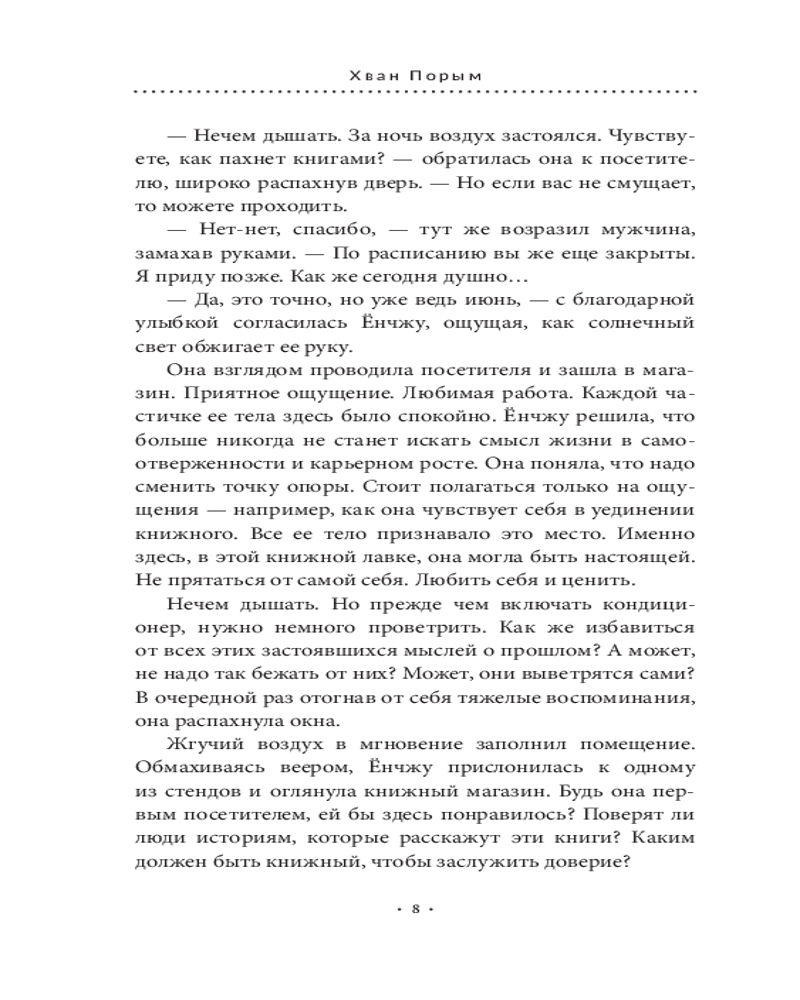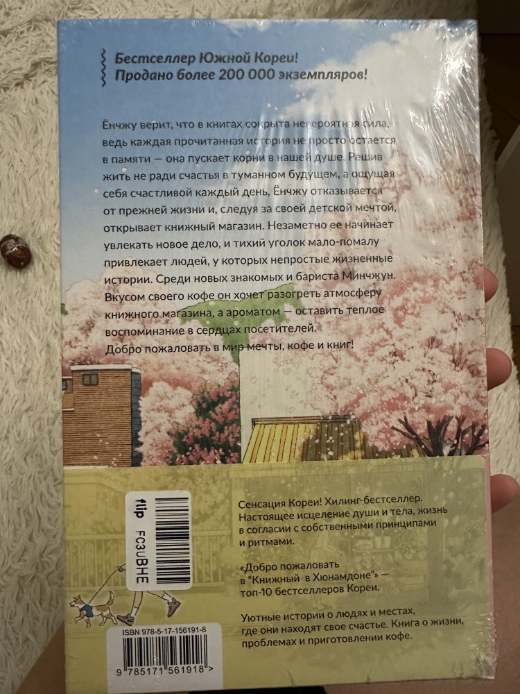 Качественный твёрдый переплёт, книгу хочется держать в руках. Именная закладка, что очень приятно. Книга читается легко, можно отложить в любой момент, события не форсируются, можно расслабиться. Но прочитать на один раз. Всё таки корейцы малоэмоциональны, всё слишком упорядоченно. Тема актуальна на сегодняшний день - не потерять себя в стремительном потоке жизни и чужих ожиданиях.