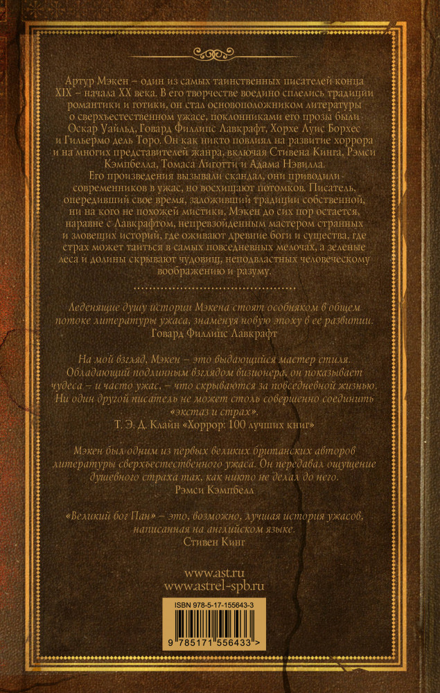 💳 Оплатить за товар можно при получении 🇰🇿 Есть бесплатная доставка по Казахстану от 1 дня 🎁 Копите бонусы с каждой покупки Серия: Легенды хоррора. Ретро Артур Мэкен — один из самых таинственных писателей конца XIX — начала XX века. В его творчестве воедино сплелись традиции романтики и готики, он стал основоположником литературы о сверхъестественном ужасе, поклонниками его творчества были Оскар Уайльд, Говард Филлипс Лавкрафт, Хорхе Луис Борхес и Гильермо дель Торо. Он как никто повлиял на развитие хоррора и на многих представителей жанра, включая Стивена Кинга, Рэмси Кэмпбелла, Томаса Лиготти и Адама Нэвилла. Его произведения вызывали скандал, они приводили современников в ужас, но восхищают потомков. Писатель, опередивший свое время, заложивший традиции собственной, ни на кого не похожей мистики, Мэкен до сих пор остается, наравне с Лавкрафтом, непревзойденным мастером странных и зловещих историй, где оживают древние боги и существа, где страх может таиться в самых повседневных мелочах, а зеленые леса и долины скрывают чудовищ, неподвластных человеческому воображению и разуму. |