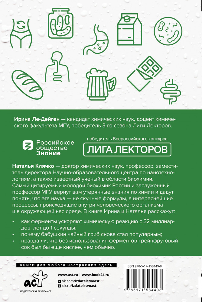 💳 Оплатить за товар можно при получении 🇰🇿 Есть бесплатная доставка по Казахстану от 1 дня 🎁 Копите бонусы с каждой покупки Серия: Код питания Ирина Ле-Дейген — кандидат химических наук, доцент химического факультета МГУ, победитель 3 сезона Лиги Лекторов. Наталья Клячко — доктор химических наук, профессор, заместитель директора Научно-образовательного центра по нанотехнологиям, а также известный ученый в области биохимии. Самый цитируемый молодой биохимик России и заслуженный профессор МГУ вернут вам утраченные знания по химии и дадут понять, что эта наука — не скучные формулы, а интереснейшие процессы, происходящие внутри человеческого организма и в окружающей нас среде. |