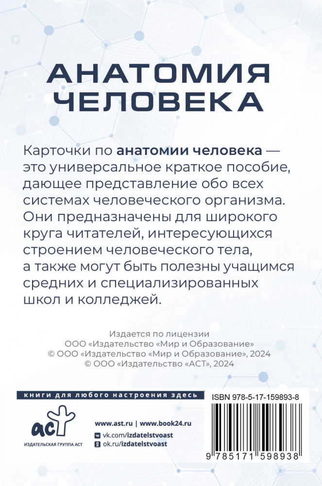 💳 Оплатить за товар можно при получении 🇰🇿 Есть бесплатная доставка по Казахстану от 1 дня 🎁 Копите бонусы с каждой покупки Серия: Самусев. Анатомия человека (коробка) Карточки по анатомии человека — это универсальное краткое пособие, дающее представление обо всех системах человеческого организма. Цветные рисунки с подробными указателями и названиями. От автора классических учебников по анатомии и физиологии Р.П. Самусева. Они предназначены для широкого круга читателей, интересующихся строением человеческого тела, а также могут быть полезны учащимся средних и специализированных школ и колледжей. |