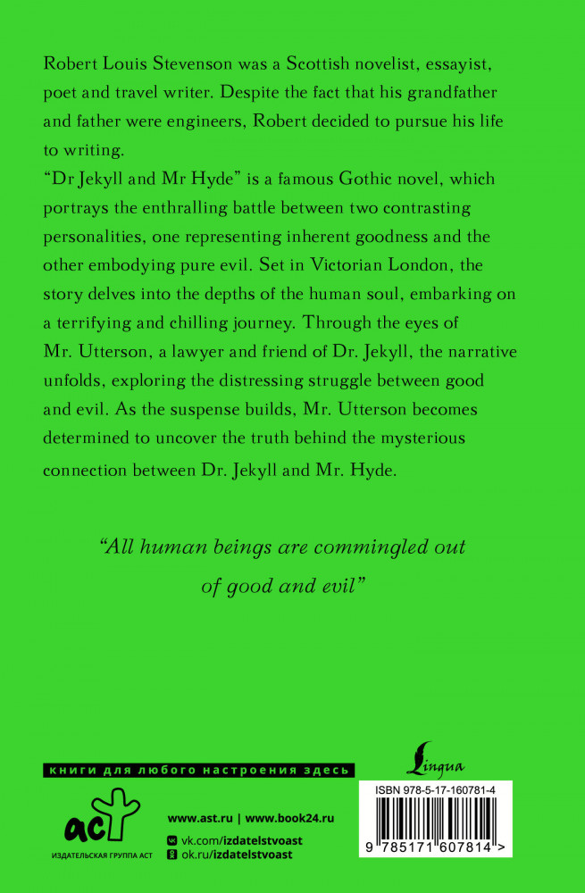 💳 Оплатить за товар можно при получении 🇰🇿 Есть бесплатная доставка по Казахстану от 1 дня 🎁 Копите бонусы с каждой покупки Серия: Exclusive Classics Hardcover Роберт Льюис Стивенсон (1850-1894) — шотландский писатель и поэт. Родился в семье инженеров, но не стал продолжать семейную традицию и получил высшее образование в Эдинбургском университете на юридическом факультете, хотя изначально учился на инженера. Повесть «Доктор Джекил и мистер Хайд» Стивенсона была опубликована в 1886 году. В ней автор рассуждает на тему двойничества и пытается её переосмыслить. Сюжет повествует о странных событиях, происходящих в Лондоне, непосредственное участие в которых принимает Эдвард Хайд — жестокий и отвратительный человек. Эти события привлекают внимание господина Аттерсона, который работает нотариусом. Хайд каким-то образом связан с другом Аттерсона — доктором Джекилом. Именно этой связью интересуется нотариус. Он решает углубиться в вопрос и попытаться докопаться до истины. Чем же закончится это расследование? Ответ таится на страницах книги. В книге представлены три увлекательных произведения — «Доктор Джекил и мистер Хайд», «Злоключения Джона Николсона» и «Маркхейм». Произведения представлены в оригинале. Насладитесь историями без адаптации и сокращений! |