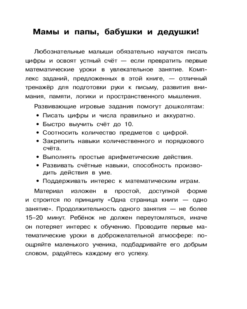 В данный момент этот товар отсутствует в продаже. Возможно, у нас найдется аналогичный или похожий товар здесь. Серия: Первые развивающие тетради В серии «Первые развивающие тетради» — книги для любознательных малышей и заботливых родителей. Рабочая тетрадь «Учимся писать цифры по опорным точкам. 4–5 лет» представляет интерес для дошкольников, а также их родителей, — игровые задания позволяют ребёнку запомнить правильное начертание цифр, развивают интеллект, формируют математические представления и ориентацию в пространстве, закрепляют правила выполнения простых арифметических действий.
