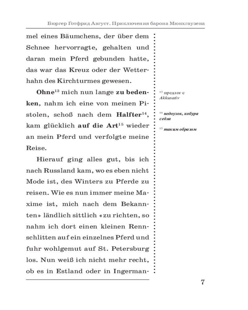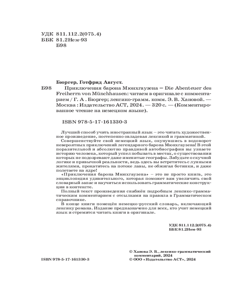 💳 Оплатить за товар можно при получении 🇰🇿 Есть бесплатная доставка по Казахстану от 1 дня 🎁 Копите бонусы с каждой покупки Серия: Комментированное чтение на немецком языке Лучший способ учить иностранный язык — это читать художественное произведение, постепенно овладевая лексикой и грамматикой. Совершенствуйте свой немецкий язык, окунувшись в водоворот невероятных приключений легендарного барона Мюнхгаузена! В этой поразительной и абсолютно правдивой библиографии вы узнаете историю человека, который успел побывать в местах, о существовании которых не подозревают даже именитые географы. Забудьте о скучной логике и привычной реальности, ведь здесь вы встретитесь с лунными жителями, прокатитесь на потоке лавы, не обжигая ботинки, и даже полетаете на ядре! «Приключения барона Мюнхгаузена» — это не просто книга, это энциклопедия удивительного, которая поможет вам увеличить свой словарный запас и научиться использовать грамматические конструкции в контексте. Полный текст произведения снабжён подробным лексико-грамматическим комментарием с отсылками на правила в Грамматическом справочнике. В конце книги помещён немецко-русский словарь, включающий лексику романа. Учите немецкий язык с удовольствием! |