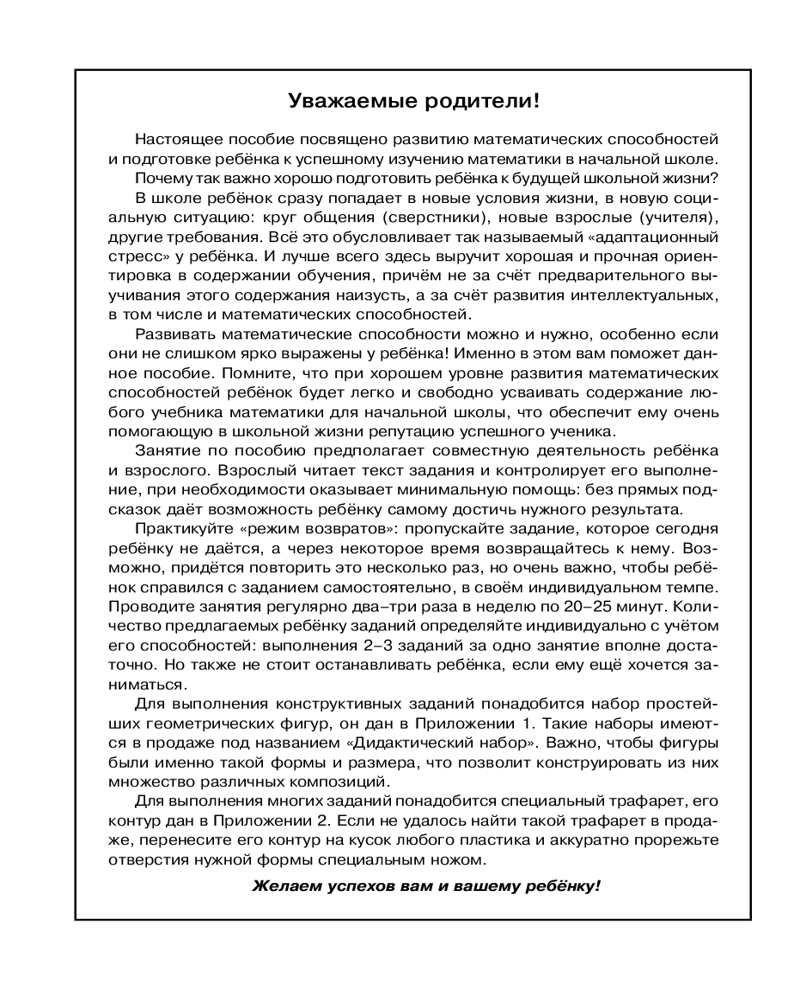 💳 Оплатить за товар можно при получении 🇰🇿 Есть бесплатная доставка по Казахстану от 1 дня 🎁 Копите бонусы с каждой покупки Серия: Год до школы Сборник «365 заданий по математике для успешной подготовки к школе» поможет познакомить дошкольника с математикой и логикой. Выполняя каждый день по 1–2 заданиям, ребенок освоит элементарный счет, познакомиться с геометрическими фигурами, научится рассуждать логически, разовьет память и внимание. Для контроля знаний дошкольника даны тесты поступающим в 1 класс, а также критерии их оценивания. Для удобства работы с пособием в Приложении даны набор для вырезания и конструирования фигур и трафарет для работы. |